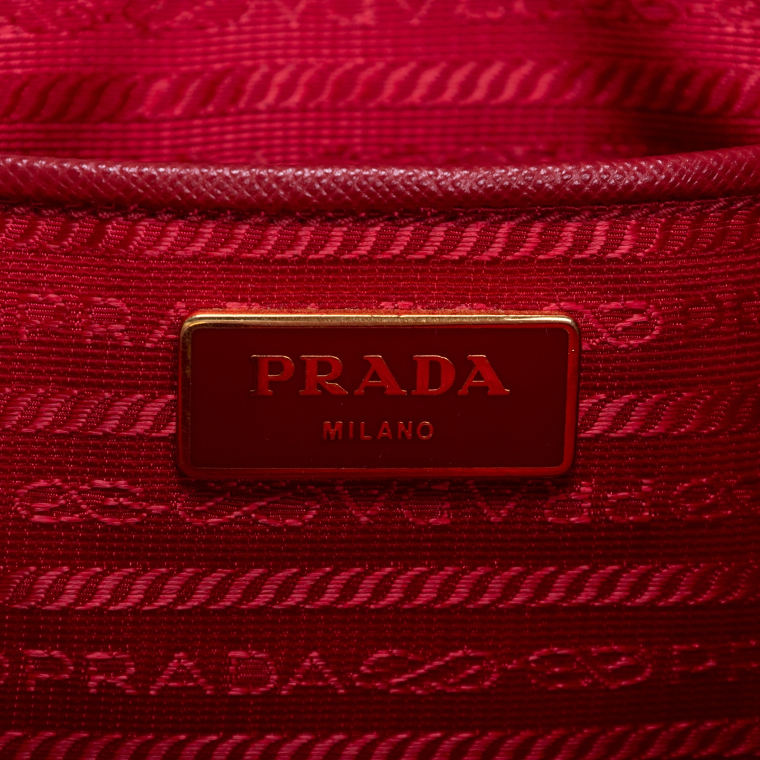 A vintage Prada red calf leather Saffiano Lux Tote bag with a certificate of authenticity. Approximately 26cm height, 38cm width.
