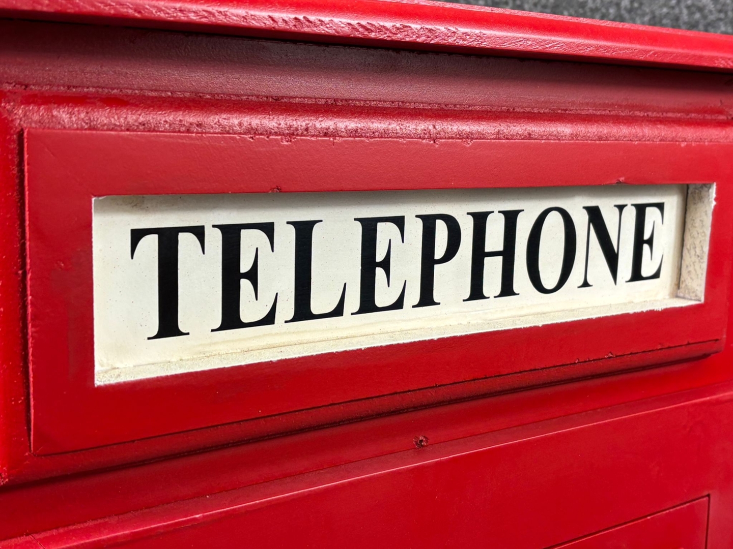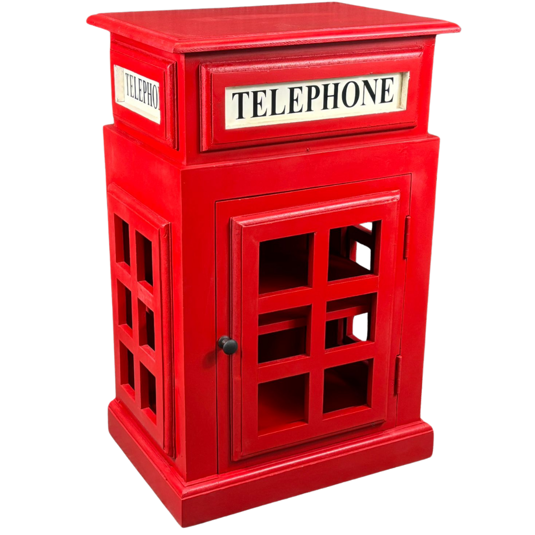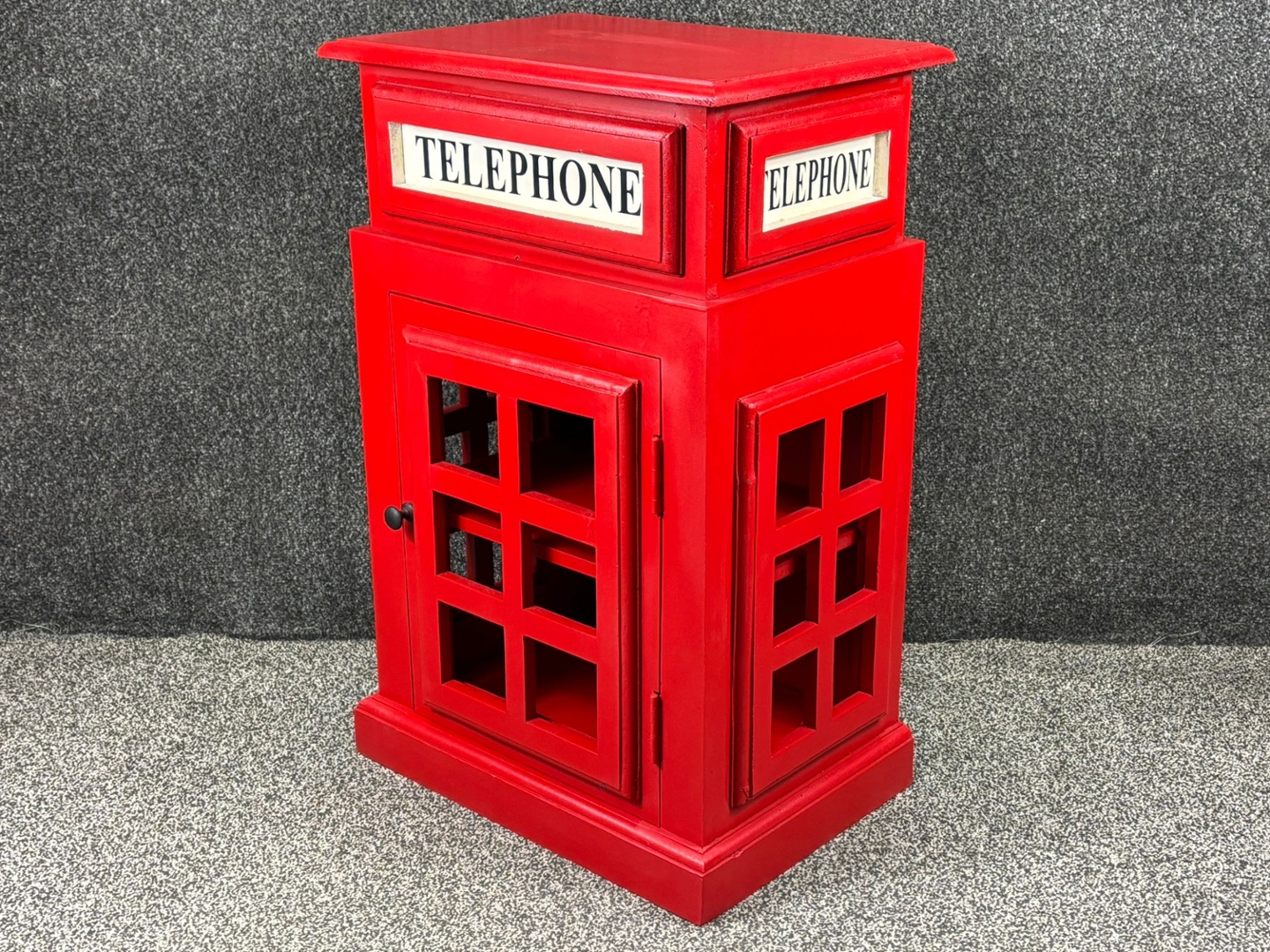 A Red British Telephone Box Style Side Table Cabinet. Approx 72cm height, 47cm width, 34cm depth.
