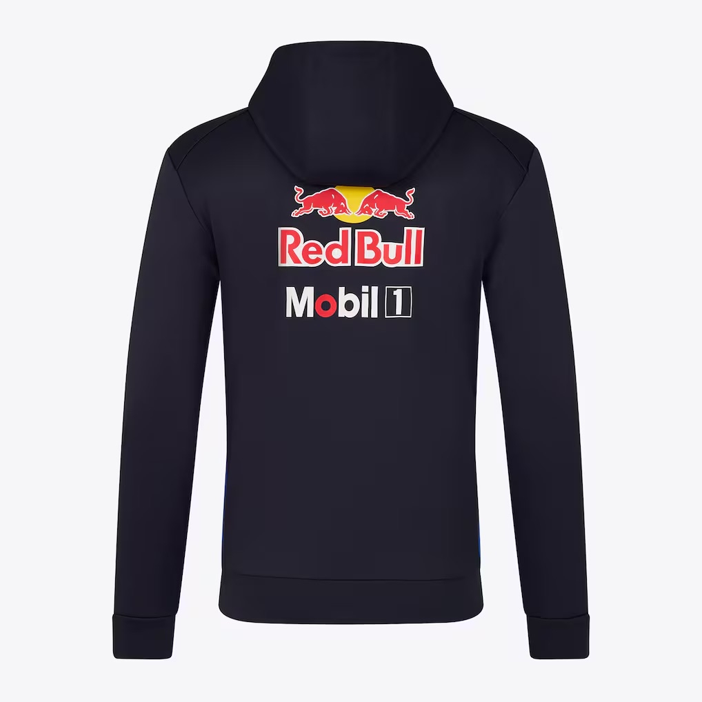 Crafted from a high-quality cotton blend, the hoodie offers a comfortable yet structured feel, ideal for everyday wear. The full zip front allows for versatile styling, while the adjustable hood and ribbed cuffs provide added practicality. Official team and sponsor branding is displayed with crisp detail, reflecting the professional finish expected from Red Bull Racing merchandise.