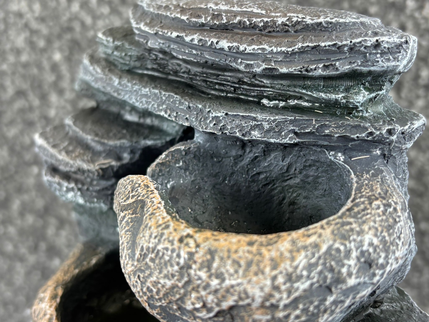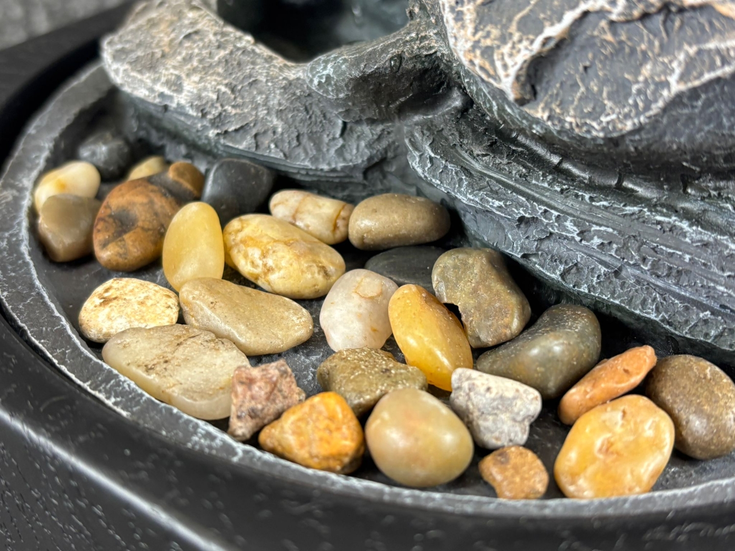With approximate dimensions of 24cm in height, 18cm in width, and 18cm in depth, this fountain is compact yet impactful. Its design makes it perfect for tabletops, desks, or garden corners, offering a tranquil focal point without taking up too much space. The detailed stone-like finish gives it a timeless and earthy appeal, complementing any setting.