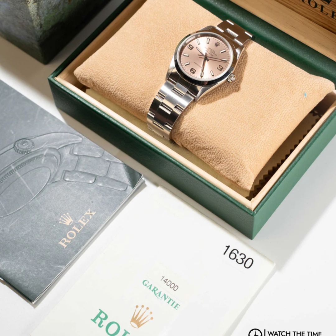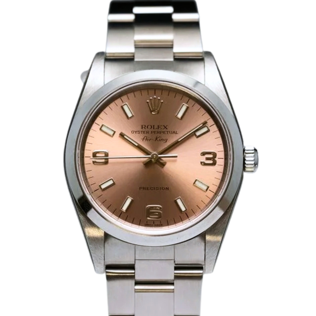 A Rolex Air-King reference 14000 crafted in stainless steel, featuring a smooth bezel and a refined salmon dial with applied baton hour markers. The compact 34mm Oyster case delivers classic proportions, while the understated dial layout reflects the Air-King’s roots as a clean, aviation-inspired Rolex designed for everyday wear. The presence of the “Precision” dial text is correct for this reference and period.