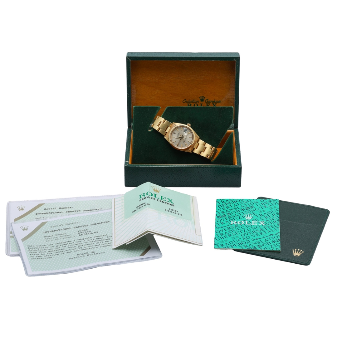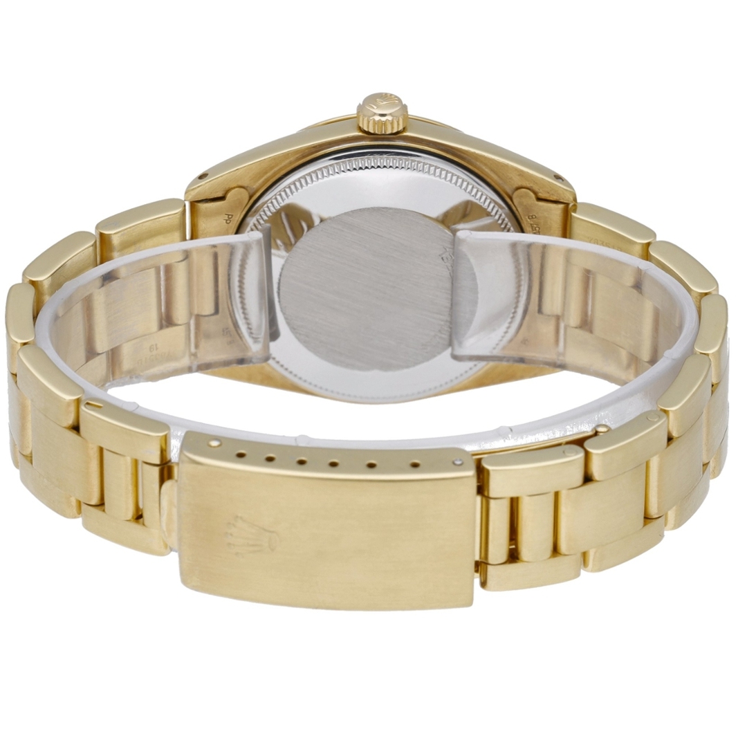 At its heart lies the reliable Rolex Calibre 3035 automatic movement — a highly respected self-winding mechanism known for its precision, durability, and smooth date-change function. Featuring a quickset date complication and chronometer certification, the Calibre 3035 ensures outstanding accuracy and dependable performance, reaffirming Rolex’s reputation for technical excellence. The gold-plated Oyster bracelet completes the piece with a cohesive and elegant finish, making it perfectly suited for both formal and everyday wear.