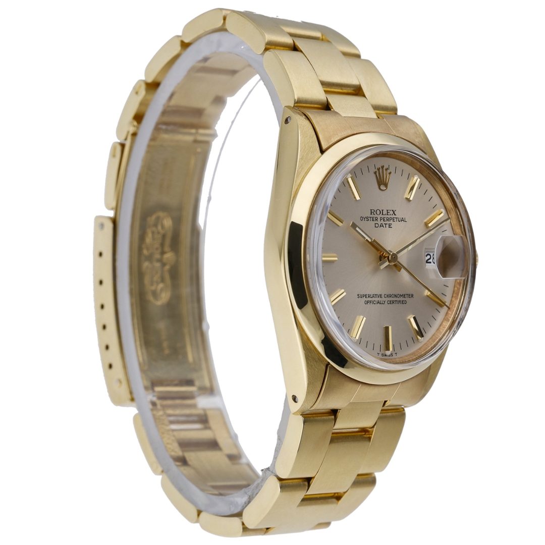 A Rolex Date, model 15505, embodies refined vintage elegance and the enduring craftsmanship for which Rolex is celebrated. Crafted in gold plate, this distinguished 34mm timepiece combines classic proportions with a timeless aesthetic. The silver dial features gold baton hour markers and matching hands, creating a clean, balanced look that reflects understated sophistication.