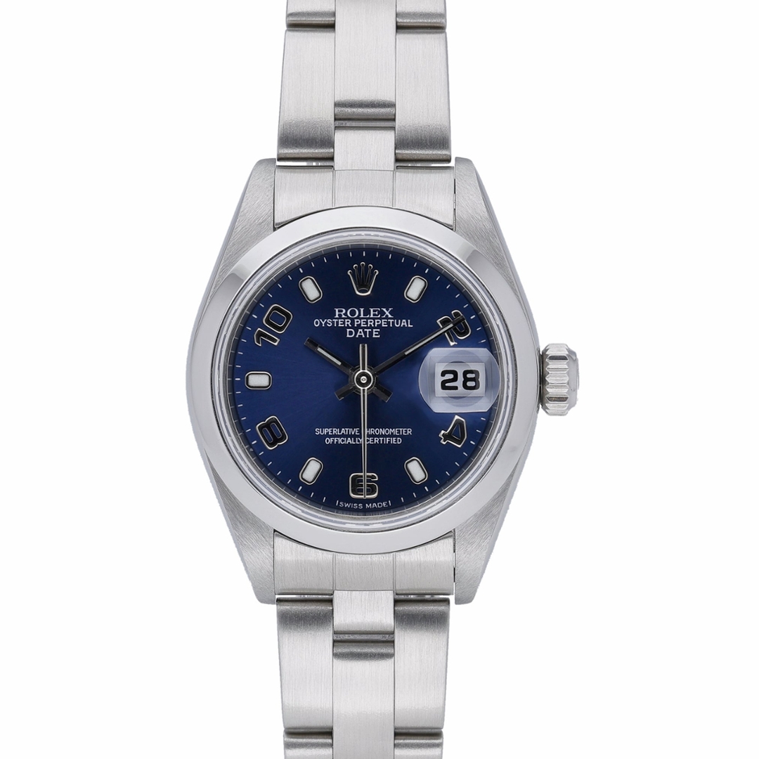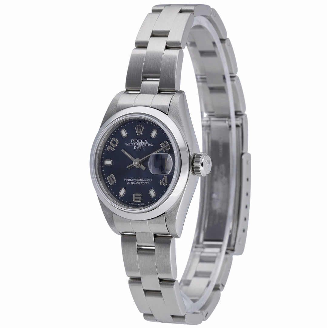 A Rolex Oyster Perpetual Date 79160 in stainless steel, featuring a vibrant blue dial that adds depth and character to its classic 26mm case. The smooth bezel keeps the profile clean and understated, while the distinctive Arabic and baton hour markers provide a subtle sport-inspired touch. The date display at 3 o’clock beneath the Cyclops lens ensures clear, practical functionality within its compact and elegant proportions.