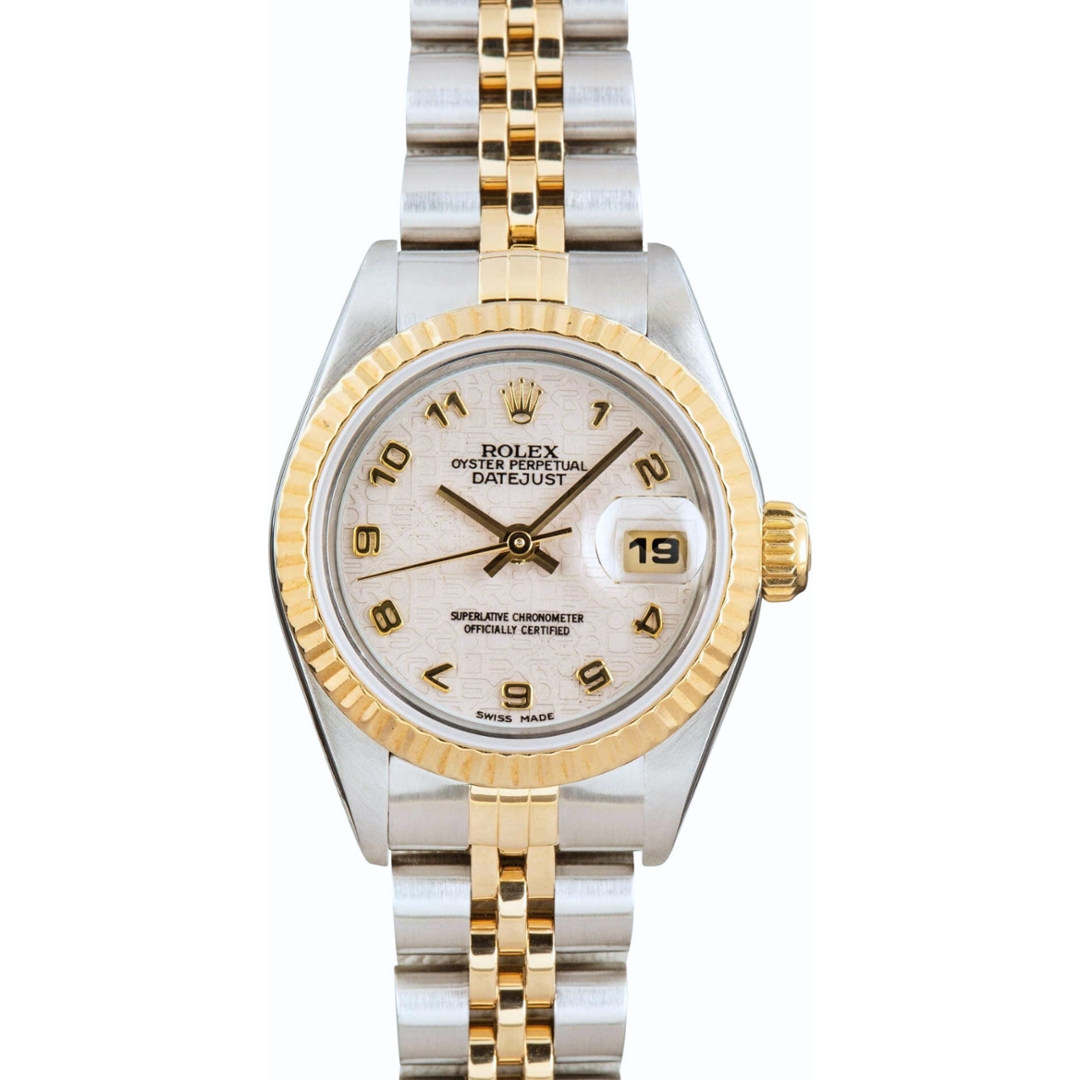A Bi-Metal Rolex Datejust 26, crafted in stainless steel and 18ct yellow gold and paired with a striking cream Jubilee Arabic dial — a highly desirable configuration that adds real character and charm to this classic reference 69173. Produced in 1989, this 26mm model delivers the unmistakable elegance of the Datejust line, complete with its signature 18ct yellow gold fluted bezel and timeless two-tone Jubilee bracelet.