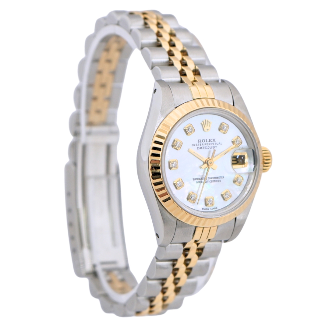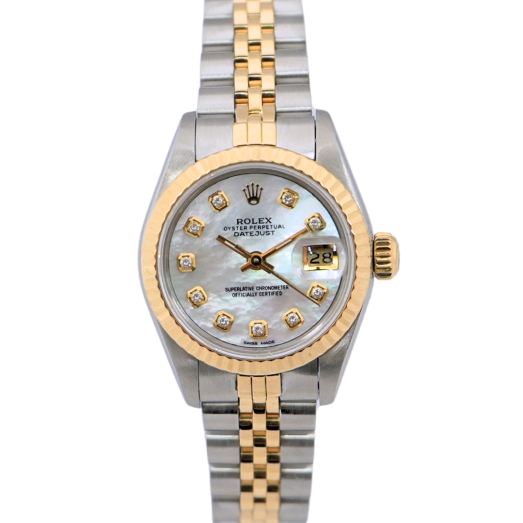 A Rolex Datejust, reference 69173, combining timeless elegance with luxurious modern detailing. Crafted from stainless steel and 18ct yellow gold, this 26mm model features an exquisite afterset diamond bezel framing a mesmerising afterset mother-of-pearl dial. The dial is enhanced with diamond-set hour markers, radiating sophistication and subtle glamour, while the classic Jubilee bracelet completes the watch with a perfect balance of comfort and refinement.