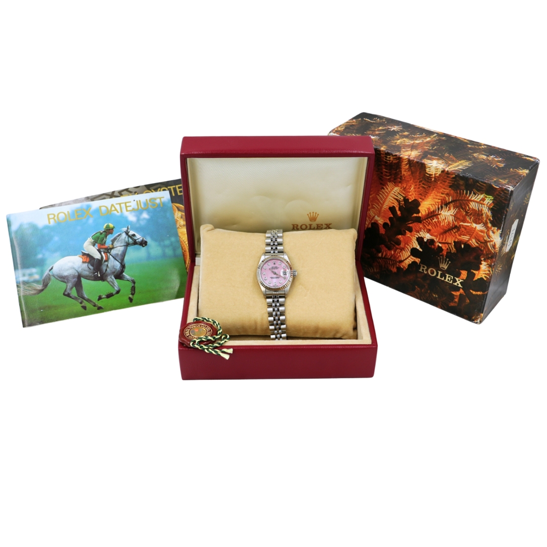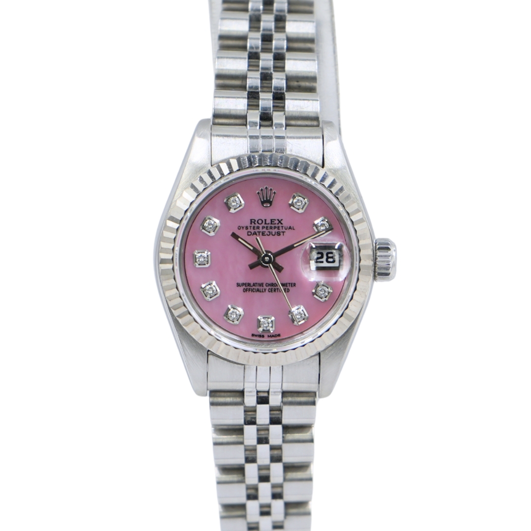 A Rolex Datejust 26 Watch that brings together classic Rolex heritage and contemporary individuality, this reference 69174 is presented beautifully in stainless steel with an 18ct white gold fluted bezel. The afterset pink mother-of-pearl dial with diamond numerals gives the piece a distinctive presence, elevating it into the realm of standout collector variants within the traditional Lady-Datejust line.