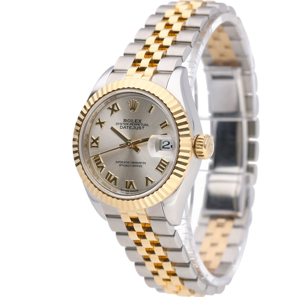 This immaculate Rolex Datejust 28, reference 279173, showcases the timeless appeal of stainless steel and 18ct yellow gold in one of Rolex’s most elegant proportions. The watch features a refined silver dial enriched with classic Roman numerals, offering a beautifully traditional aesthetic that pairs perfectly with the fluted yellow gold bezel. At 28mm, the case sits with a delicate yet confident presence on the wrist, encapsulating the sophistication that has made the Lady-Datejust an enduring favourite for generations.