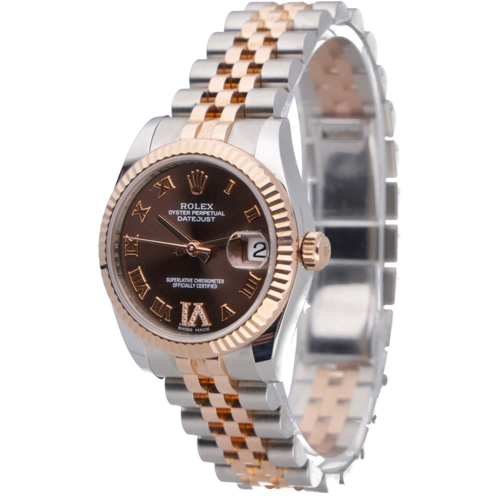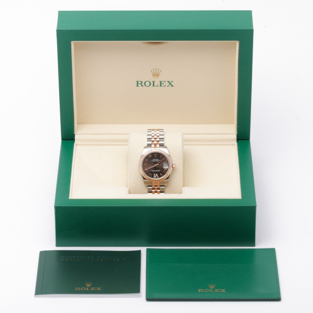 A Bi-Metal Rolex Datejust 31 Watch, Stainless Steel & 18ct Rose Gold with a Rose Gold Fluted Bezel on a Chocolate Roman Numeral Dial