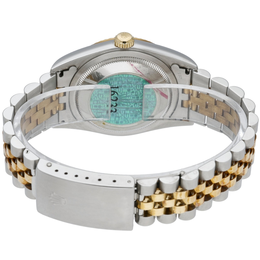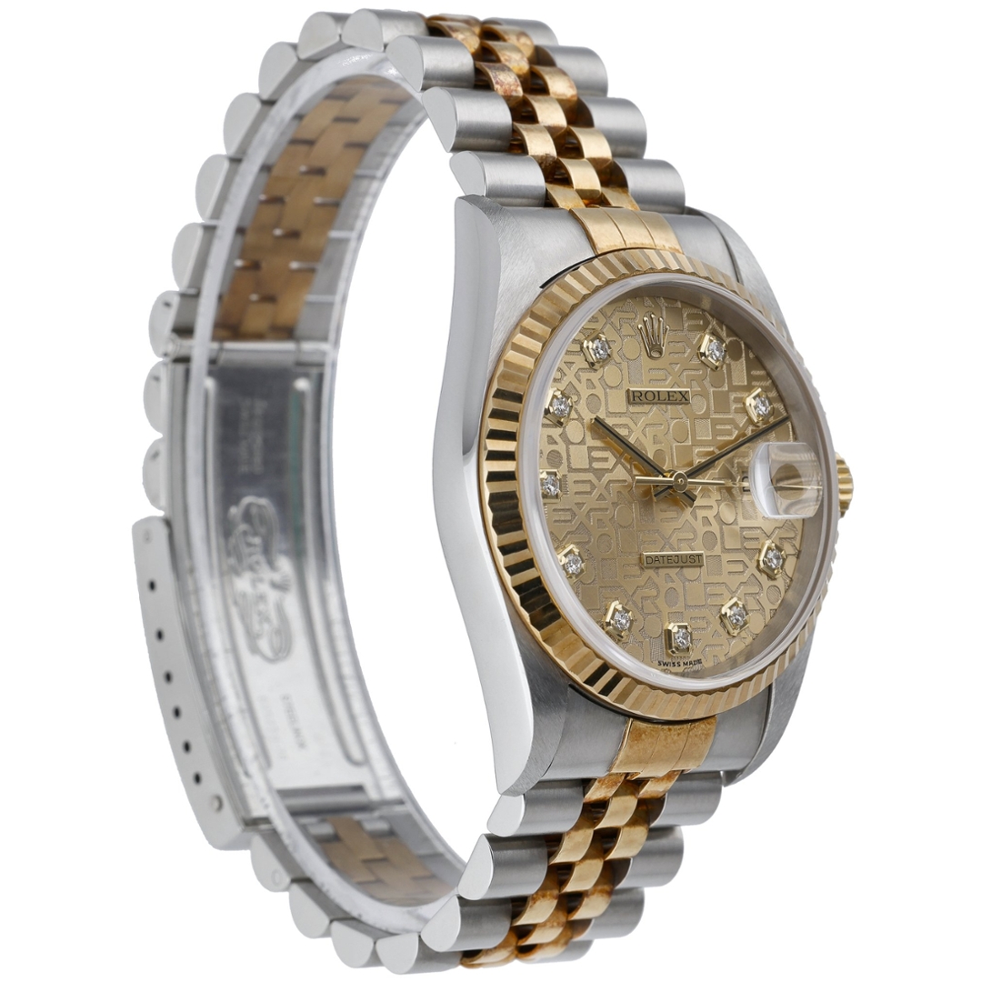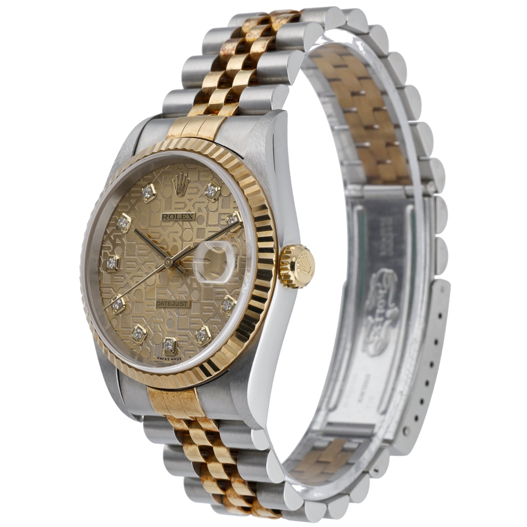 A bi-metal Rolex Datejust 36 watch crafted from stainless steel and 18ct yellow gold, featuring an exquisite champagne Jubilee dial adorned with original Rolex diamond hour markers. Model number 16233, this 2001 example embodies the perfect blend of timeless elegance and technical excellence. Powered by the Rolex automatic movement, it delivers exceptional precision and reliability, a hallmark of the Datejust collection.
