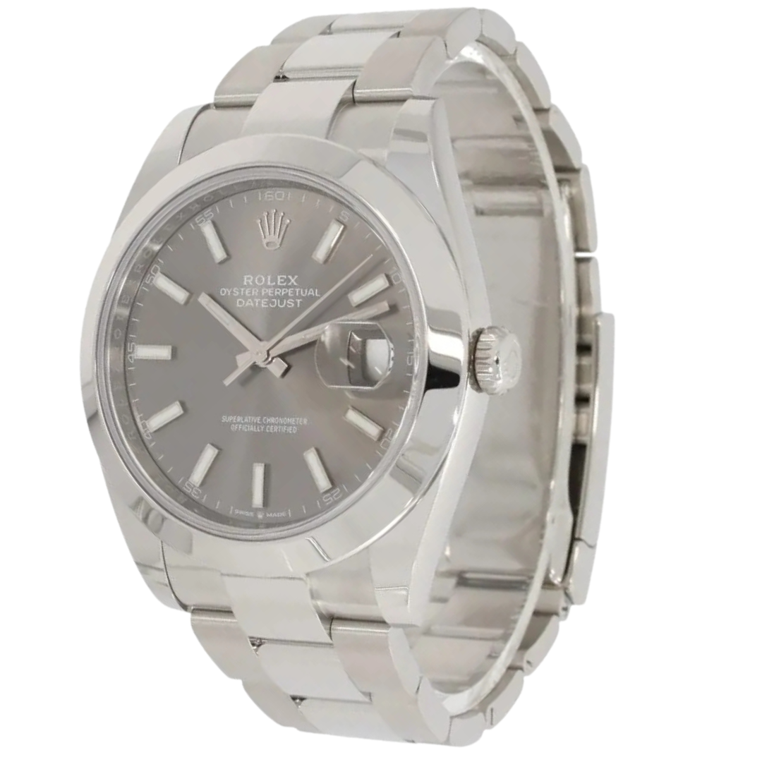 A Rolex Datejust 41, model 126300, embodies contemporary elegance with its refined design and exceptional craftsmanship. Constructed entirely from stainless steel, this 41mm model showcases Rolex’s perfect balance of sophistication and everyday versatility. The striking slate dial, enhanced by a sunburst finish, features luminous baton hour markers and polished hands for optimum legibility, while the signature Cyclops lens magnifies the date display at three o’clock — a hallmark of the Datejust collection.
