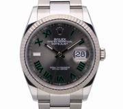 A Rolex Datejust 41 reference 126334, crafted from stainless steel and 18ct white gold, presented with the sought-after slate grey “Wimbledon” dial — featuring distinctive green Roman numerals and a refined sunray finish that shimmers under light. The fluted 18ct white gold bezel adds a sophisticated touch, perfectly complementing the sporty elegance of the Oyster bracelet.