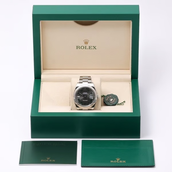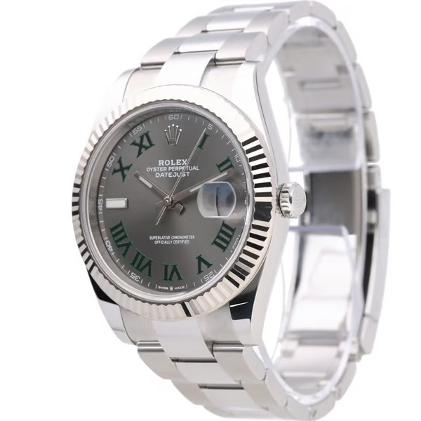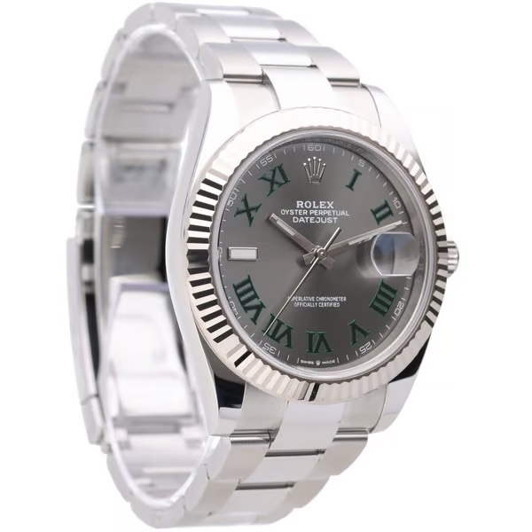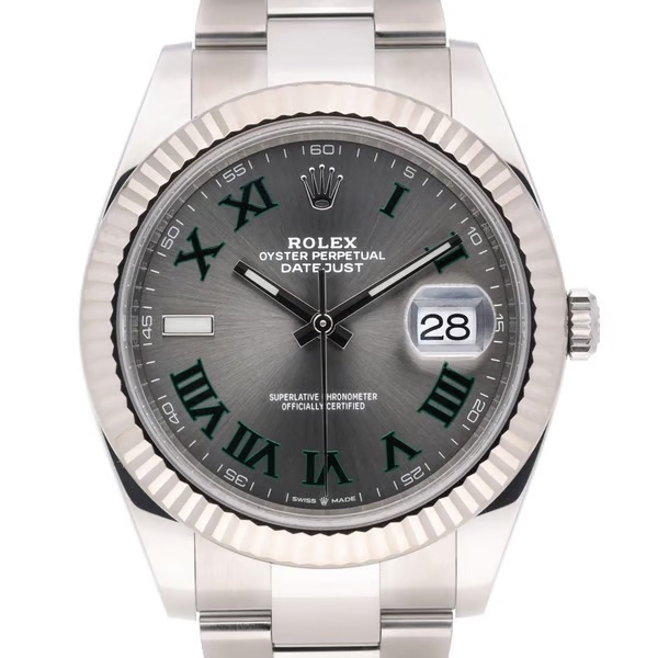 A Rolex Datejust 41 Watch that reflects the perfect harmony of precision, presence, and prestige. Crafted from robust stainless steel, this exceptional timepiece features a captivating grey dial enhanced by elegant green Roman numeral hour markers, offering a subtle yet distinctive contrast. The fluted bezel in 18ct white gold adds a refined brilliance, while the 41mm Oyster case and matching bracelet ensure both durability and timeless appeal.