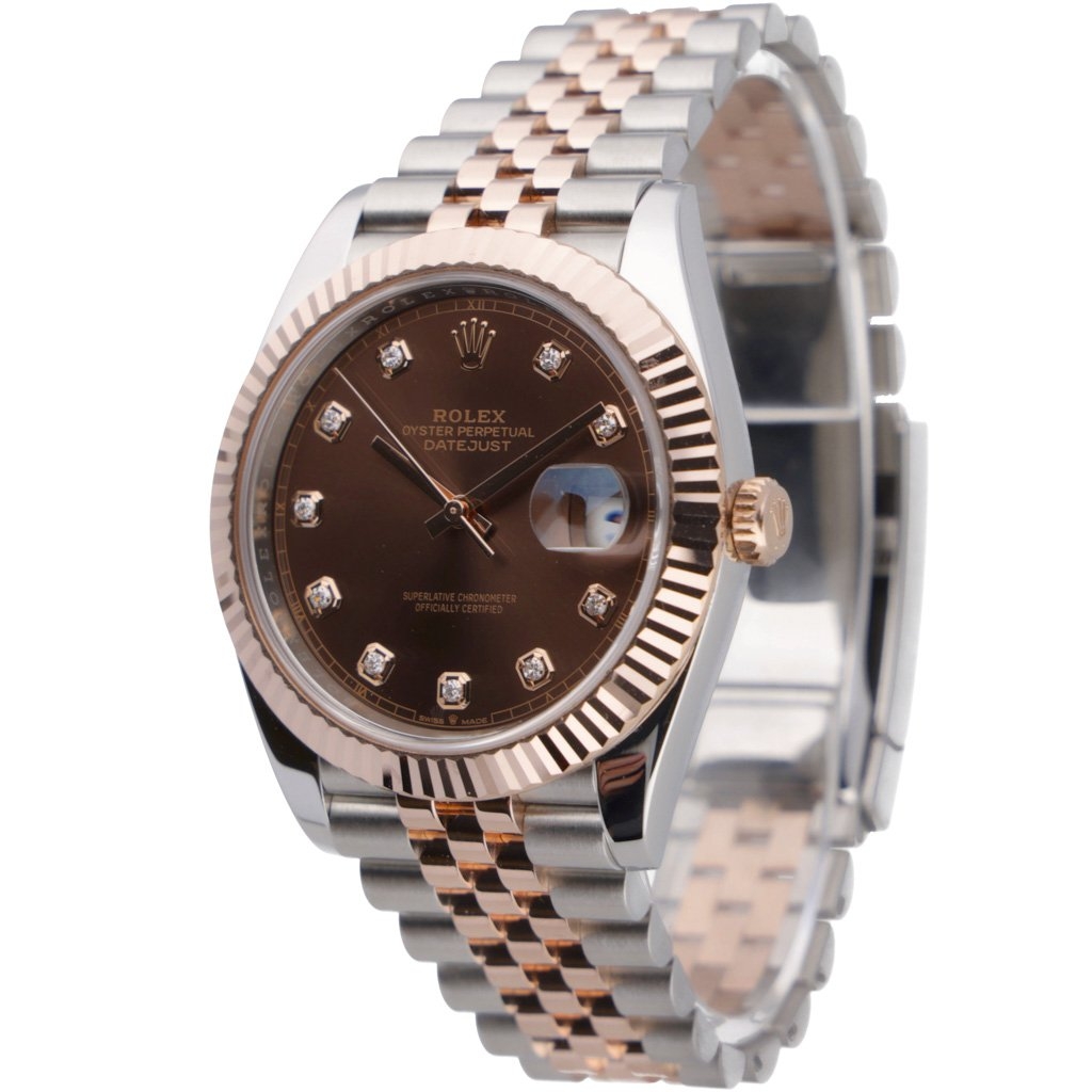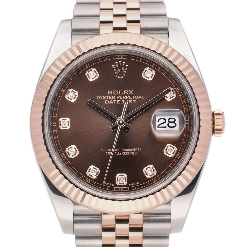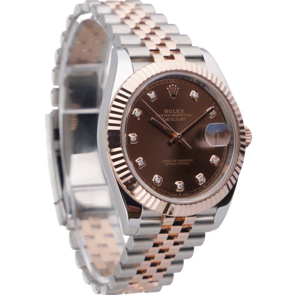 The Bi-Metal Rolex Datejust 41 in stainless steel and 18ct rose gold with a rose gold fluted bezel and a chocolate original diamond numeral dial is not just a watch but a testament to elegance, precision, and timeless appeal.