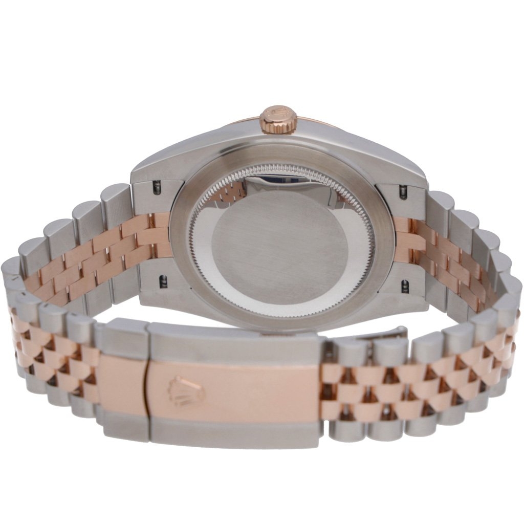 A Bi-Metal Rolex Datejust 41, harmonising stainless steel with 18ct rose gold, embodies sophistication and luxury with its exquisite design and impeccable craftsmanship. Its 41mm case size exudes a perfect balance of strength and elegance, ideal for those who appreciate both robustness and refined aesthetics.