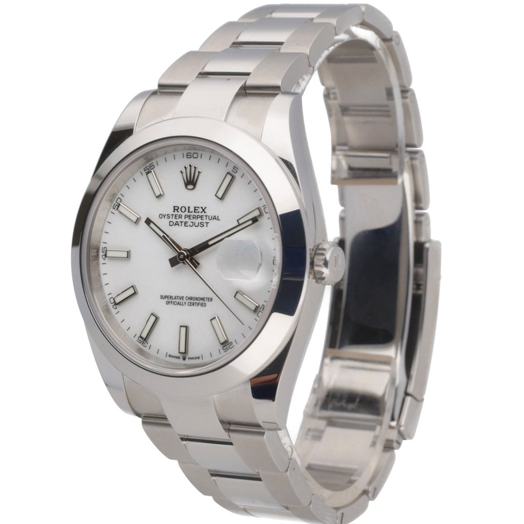 A Datejust 41 Rolex Watch, Stainless Steel on a White Dial.