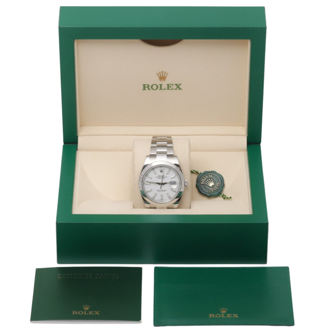 Dated 2024 and presented in immaculate condition, this example is accompanied by its original Rolex box, full set of paperwork, and certification. Backed by the Rolex manufacturer's warranty until 2029, it offers complete confidence and long-term reliability. The Datejust 41 in white is a perfect blend of sophistication and practicality — a modern classic that seamlessly transitions from everyday wear to formal occasions.