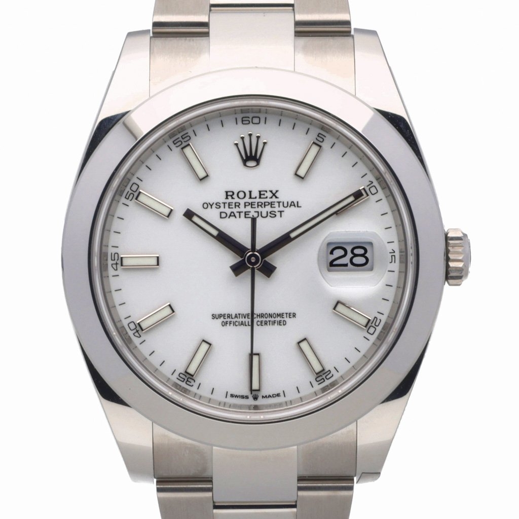 A Rolex Datejust 41, model 126300, embodies timeless sophistication and the precision engineering that defines the Rolex name. Crafted entirely from stainless steel, this 41mm model presents a clean, modern aesthetic, enhanced by its smooth domed bezel and elegant white dial. The dial features luminous baton hour markers and polished hands, offering exceptional legibility and understated refinement. The signature Cyclops lens magnifying the date display at three o’clock completes this unmistakably classic design.