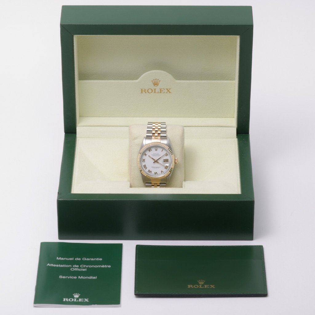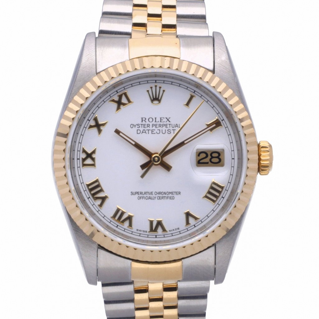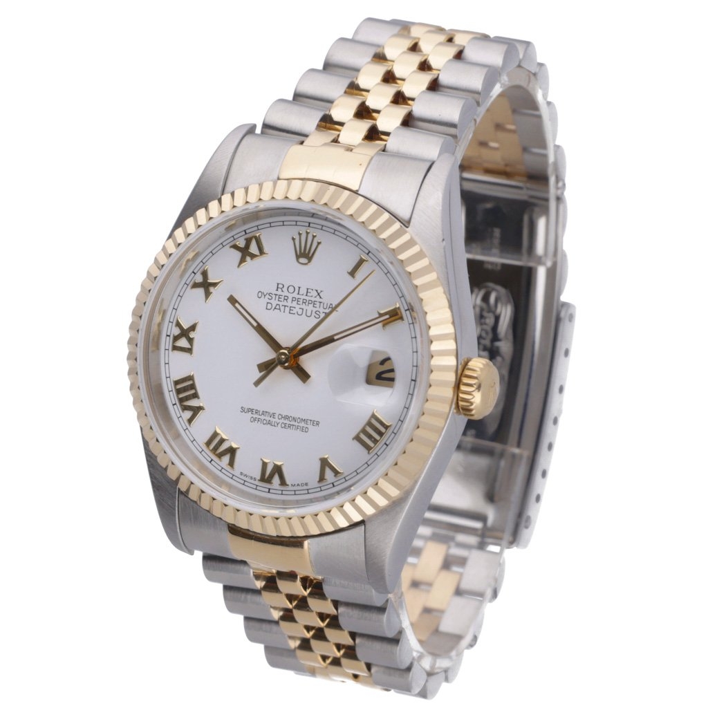 A Rolex Datejust 36 Watch, crafted in stainless steel and 18ct yellow gold and presented on a crisp white Roman numeral dial. Reference 16233 is one of the most iconic and timeless configurations in the classic Datejust line, celebrated for its perfect proportions, traditional fluted bezel and unmistakable two-tone Jubilee bracelet. The clean white dial, paired with gold Roman numerals, offers exceptional legibility and a refined, elegant character that suits every occasion.