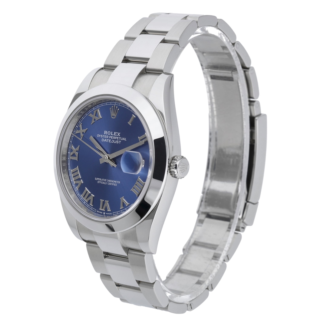 A Rolex Datejust 41 Watch, Stainless Steel on an Azzuro Blue Roman Dial.