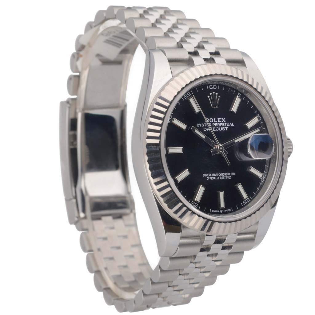 A Rolex Datejust 41 Watch, model number 126334, is a pinnacle of horological excellence and investment potential. Crafted from stainless steel with an exquisite 18ct white gold fluted bezel, it exudes sophistication and timeless elegance. Its black dial provides a striking contrast, enhancing its allure and making it a versatile accessory for any occasion.