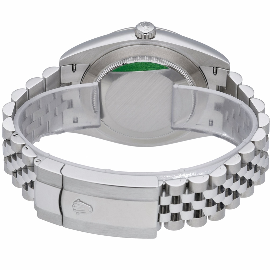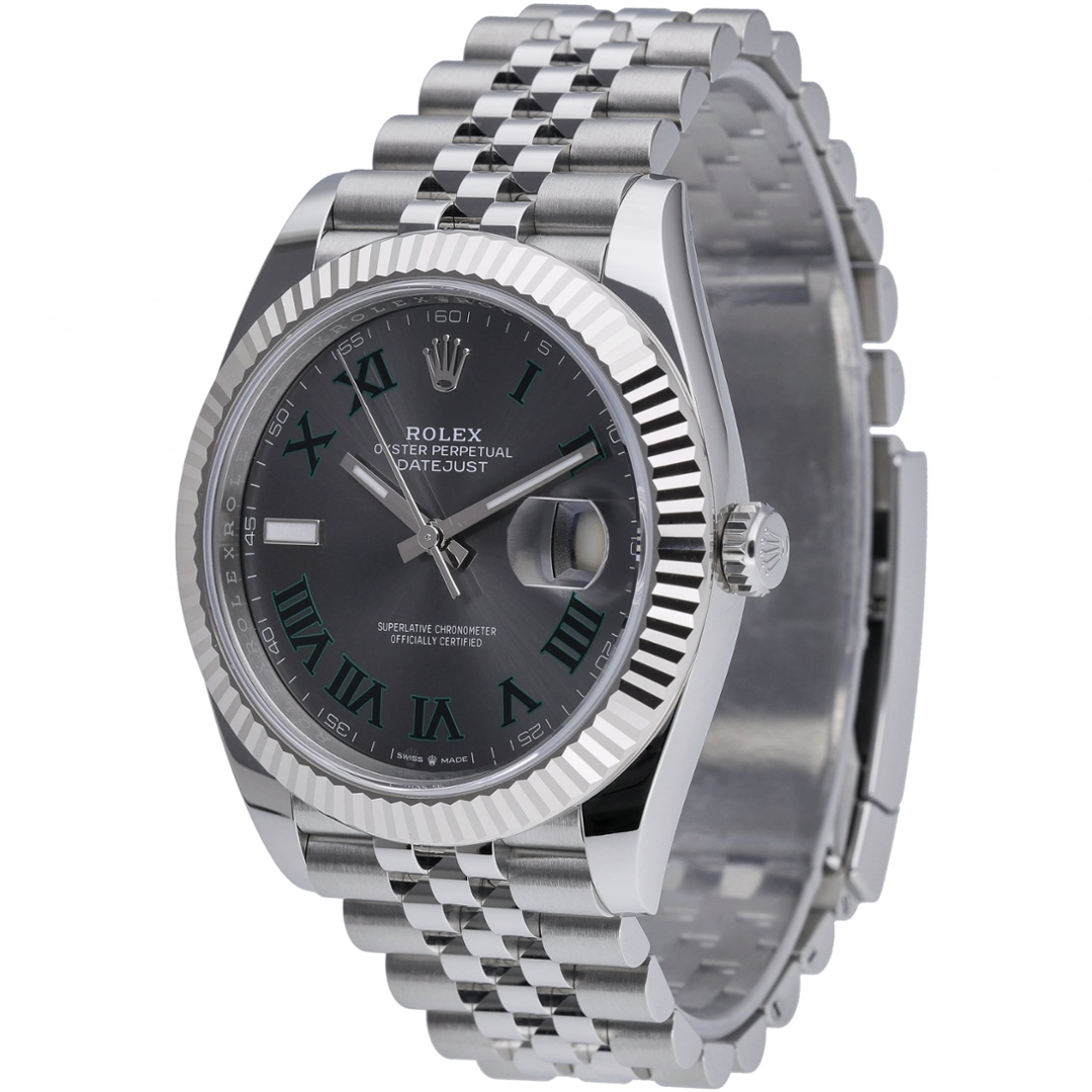 A Rolex Datejust 41 "Wimbledon" Watch that captures the essence of refined sophistication and enduring elegance. Crafted from stainless steel and 18ct white gold, this model strikes a perfect balance between strength and luxury. The captivating slate grey dial features striking green Roman numeral hour markers, adding a distinctive pop of colour while maintaining a classic air of restraint. Its fluted white gold bezel catches the light beautifully, creating a subtle contrast against the smooth lines of the Oyster case and the iconic Jubilee bracelet.