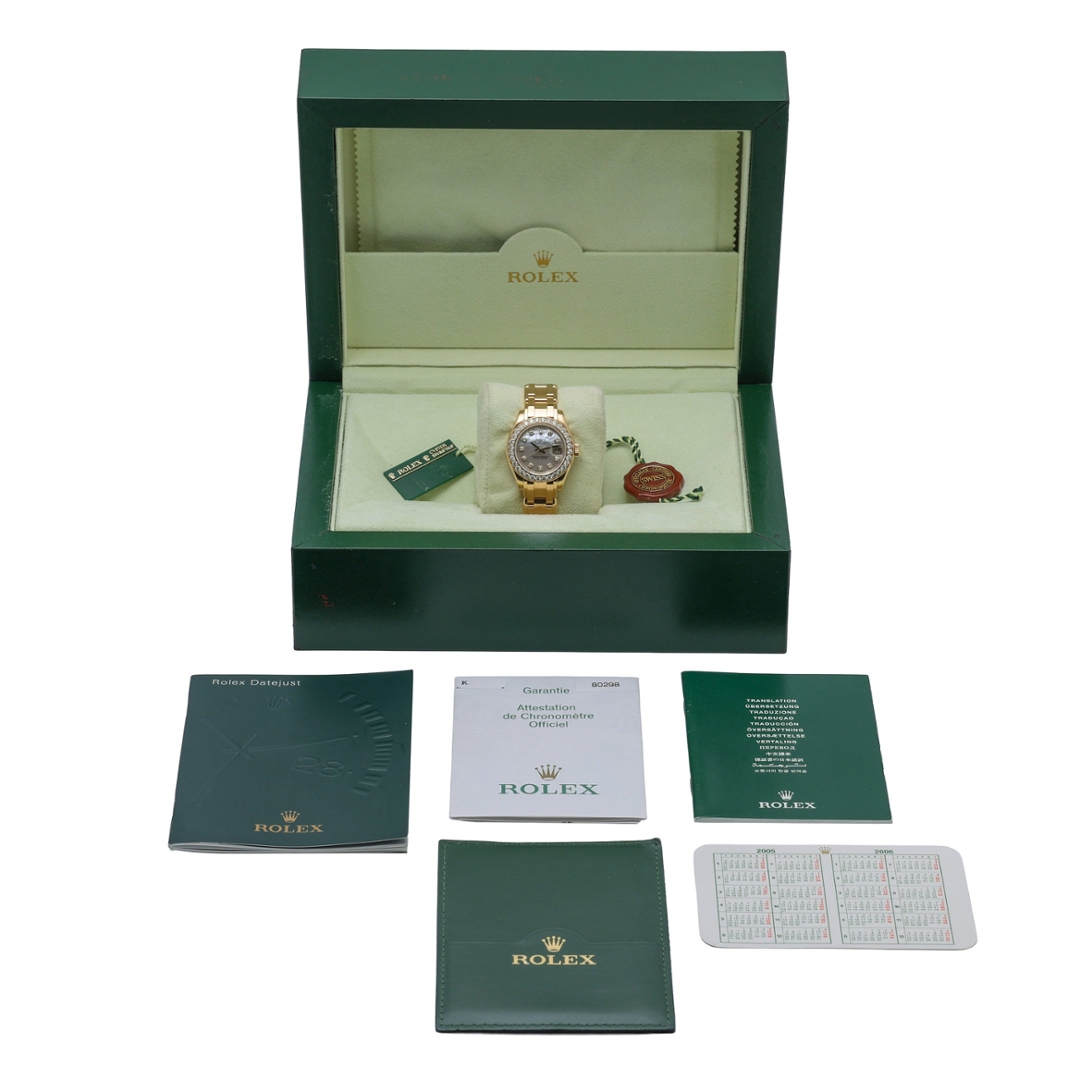 The 29mm case houses Rolex’s automatic movement, delivering the precision and reliability expected from the Pearlmaster collection. Its immaculate condition highlights how well this piece has been preserved — a truly elegant and prestigious choice for collectors seeking a refined gold Rolex with a strong jewellery aesthetic.