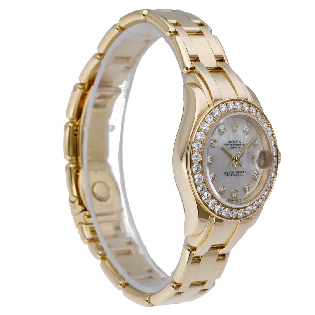A Rolex Datejust Pearlmaster crafted entirely from 18ct yellow gold, offering one of the most luxurious expressions within the Datejust line. This reference 80298 features a stunning diamond bezel paired with a beautifully iridescent mother-of-pearl dial, set with diamond hour markers that elevate the watch with exceptional brilliance and presence.