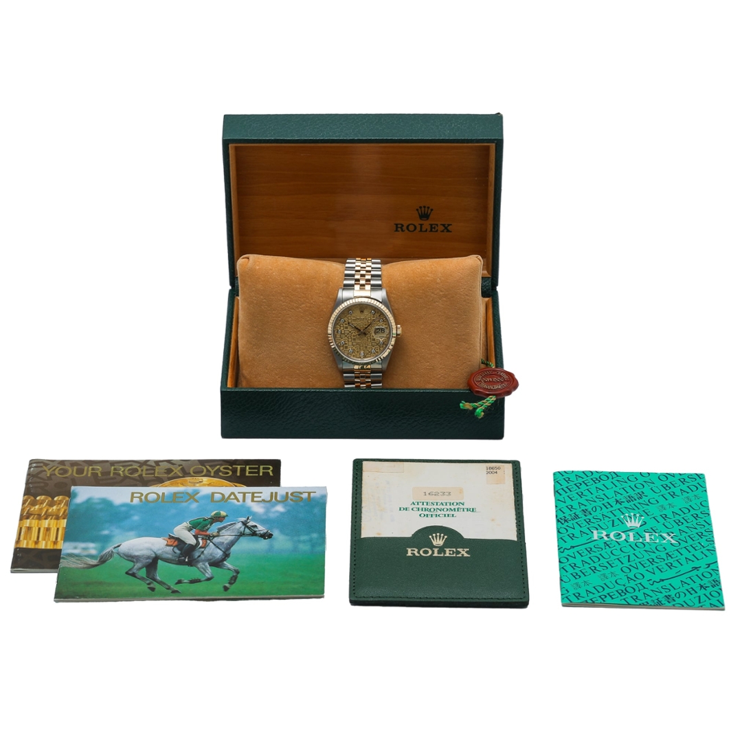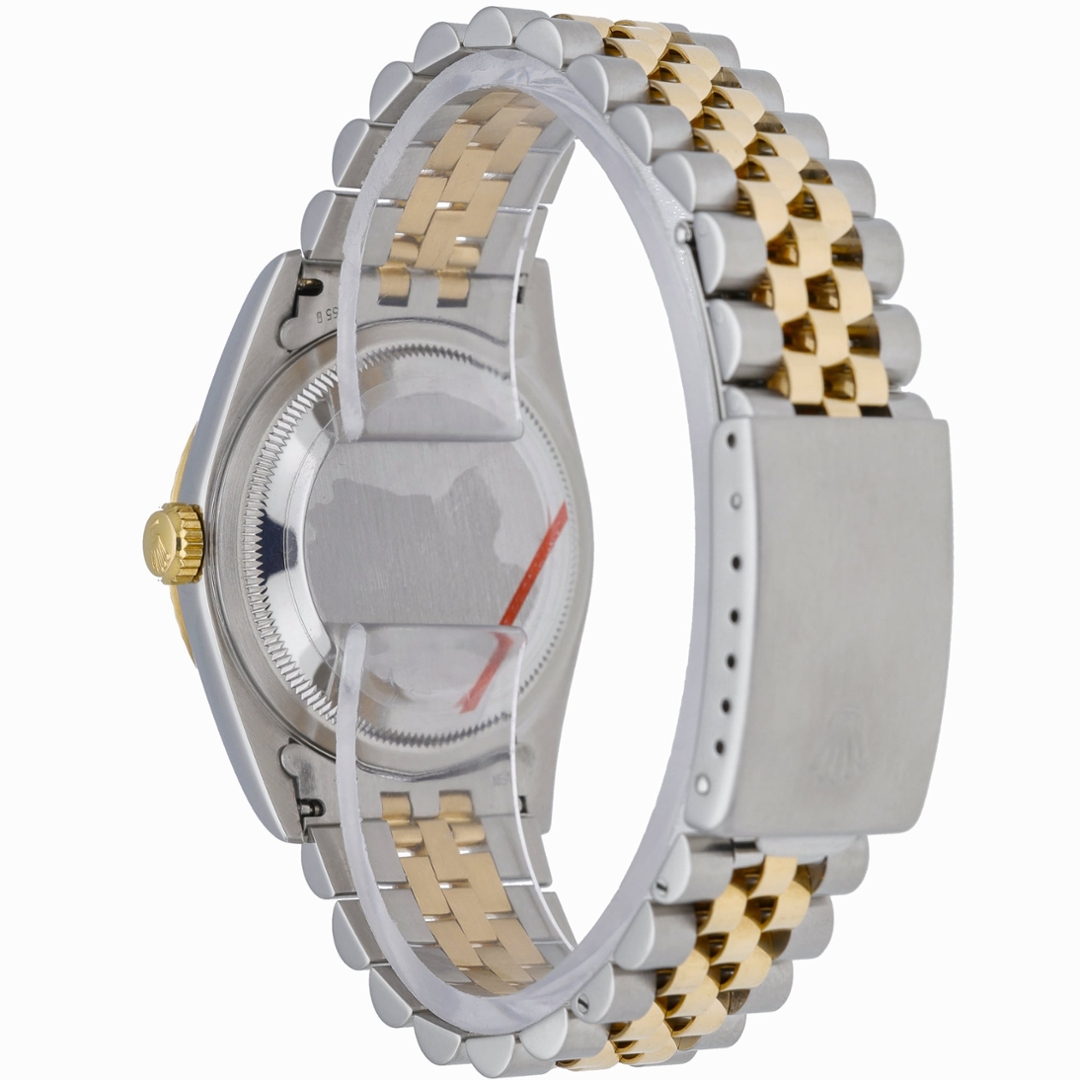 This bi-metal Rolex Datejust 36 reference 16233 features the classic 36mm Oyster case in stainless steel, paired with an 18ct yellow gold fluted bezel and matching Jubilee bracelet. The champagne Jubilee dial is distinguished by the repeating Rolex motif and original Rolex diamond numerals, complemented by gold hands and applied coronet. An acrylic crystal with cyclops date magnification completes the familiar vintage Datejust profile.