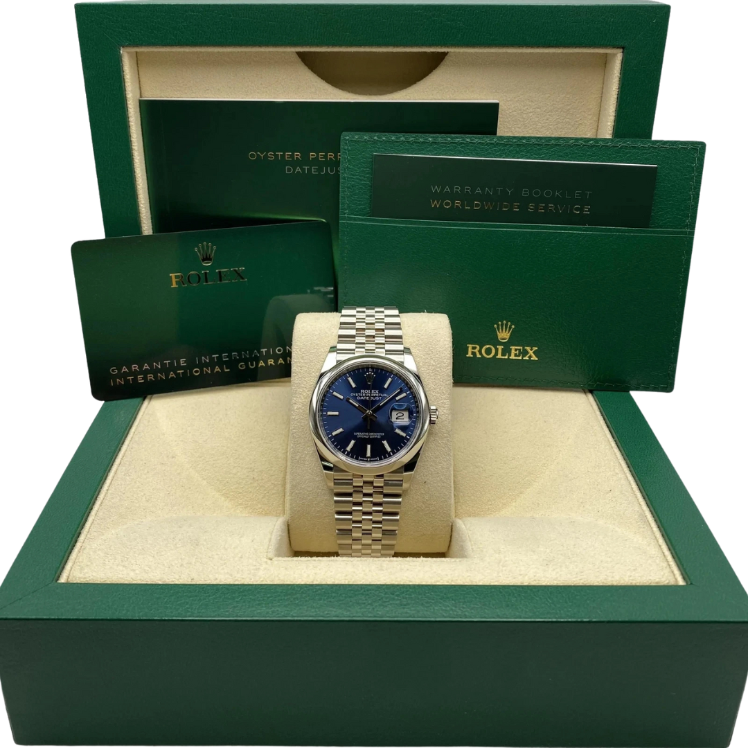 This Rolex Datejust reference 126200 is a modern 36mm example that perfectly balances heritage proportions with contemporary refinement. Crafted in stainless steel, it features a smooth bezel and the classic Oyster bracelet, giving the watch a clean, understated profile. The rich blue dial adds depth and versatility, shifting subtly in different light while remaining timeless and easy to wear across both formal and casual settings.