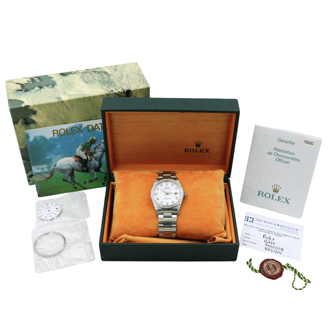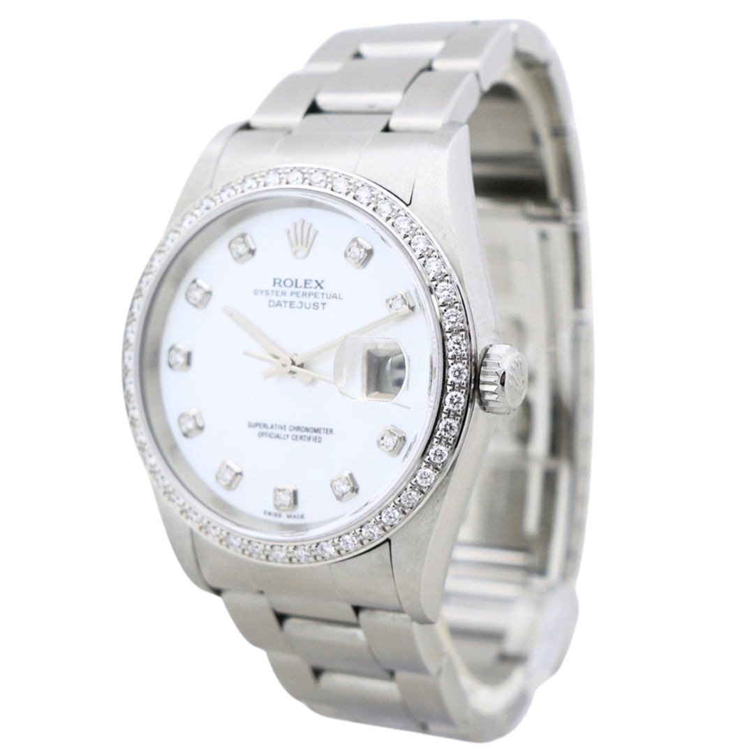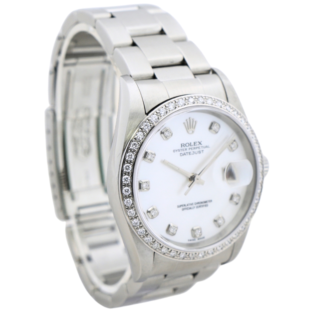 A Rolex Datejust reference 16220 from 2005, presented in stainless steel with a 36mm Oyster case. This example is fitted with an afterset diamond bezel and an afterset white mother-of-pearl dial with diamond hour markers, offering a more contemporary, jewellery-led aesthetic while retaining the classic proportions that define the Datejust.