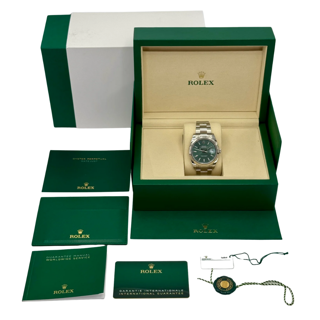 A Rolex Datejust 41 Watch, Stainless Steel with an 18ct White Gold Fluted Bezel on a Green Dial.