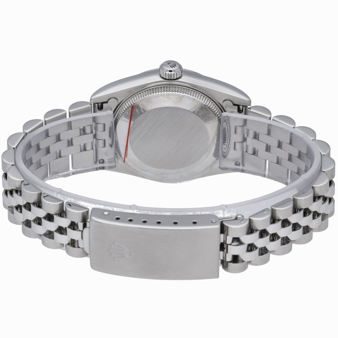 The silver dial introduces subtle shine, enhanced by original Rolex diamond-set numerals that add definition without overpowering the design. A cyclops lens magnifies the date at 3 o’clock, while applied hour markers and polished hands maintain excellent legibility on the luminous dial.