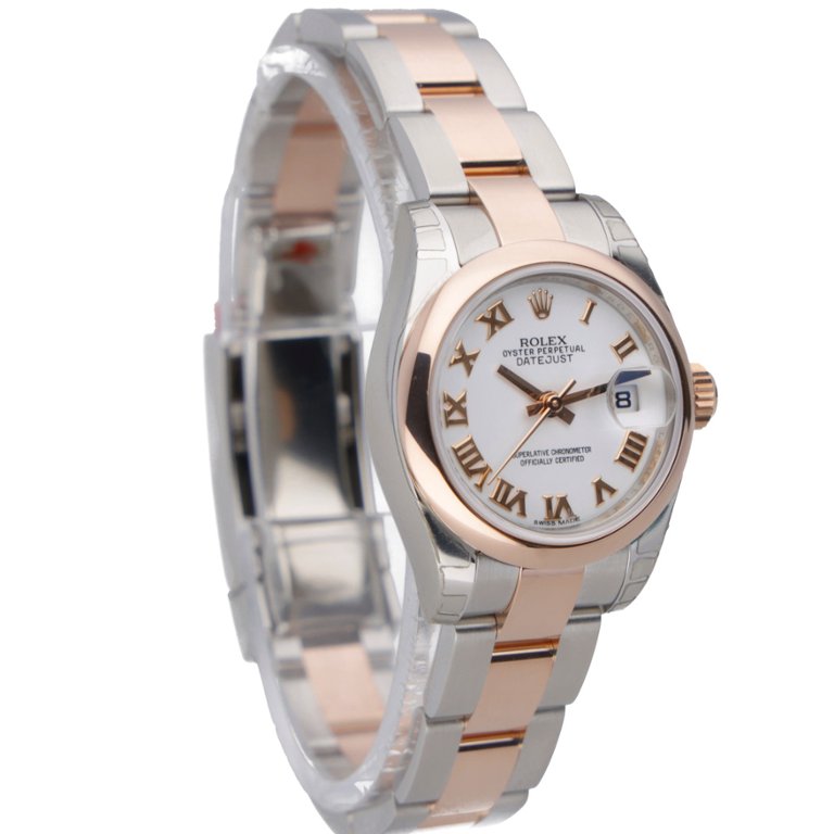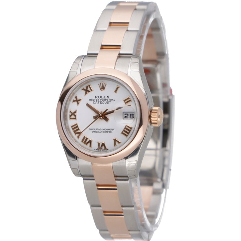 A bi-metal Rolex Datejust reference 179161 is presented in stainless steel and 18ct Everose gold, featuring the classic 26mm Oyster case. The watch is fitted with a white mother-of-pearl dial, complemented by applied rose gold Roman numerals and matching hands, with the signature date display at 3 o’clock beneath the Cyclops lens. The smooth Everose gold bezel provides a refined contrast against the Oystersteel case, maintaining the Datejust line's balanced proportions.