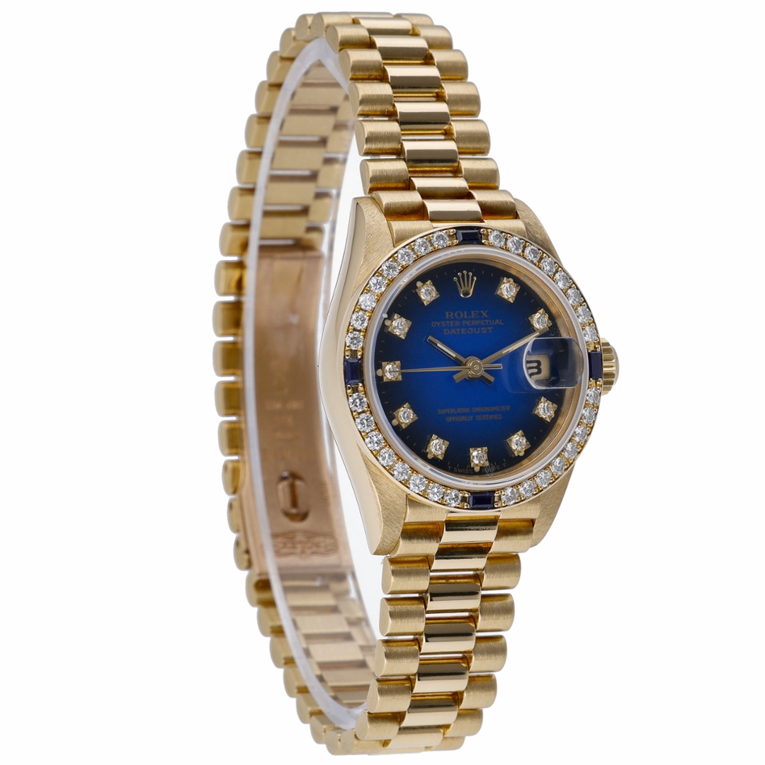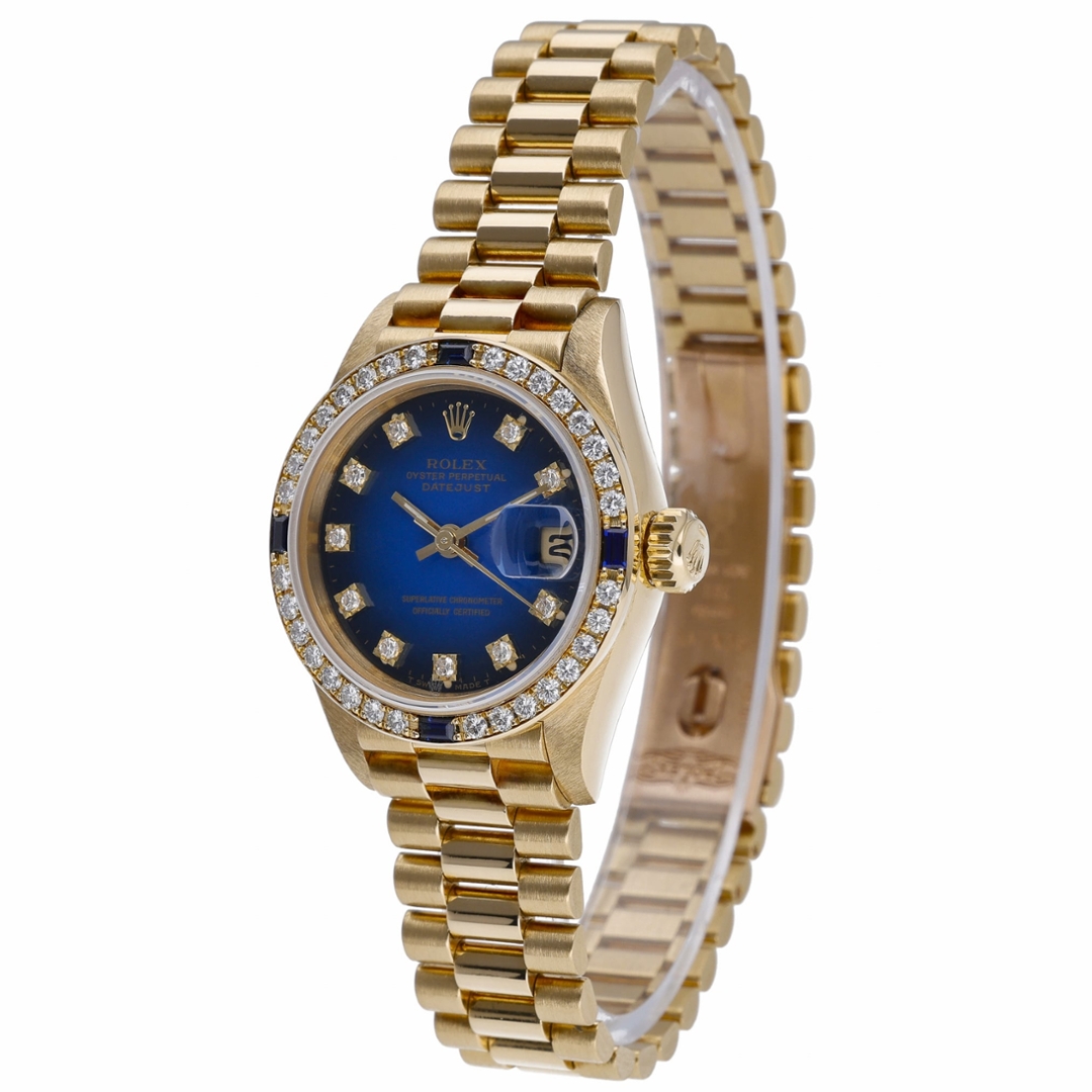 A Rolex Datejust reference 69088 is presented in full 18ct yellow gold, featuring the classic 26mm Oyster case paired with a President bracelet. The watch is fitted with a rich blue dial, accented by original factory Rolex diamond hour numerals and matching gold hands, with the date displayed at 3 o’clock beneath the Cyclops lens. The bezel has been fitted with an aftermarket diamond-and-sapphire setting, adding a distinctive visual contrast.