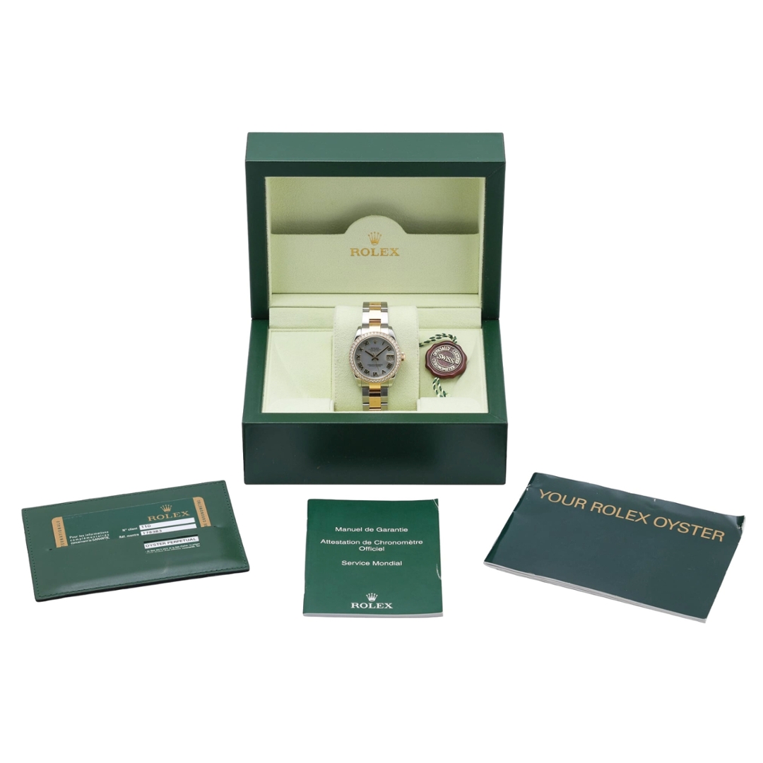 Dating to 2010, this example is offered boxed and certified, accompanied by original Rolex paperwork and supplied with a 12-month WLC warranty. A highly desirable configuration that blends steel, yellow gold, mother-of-pearl, and factory diamonds.