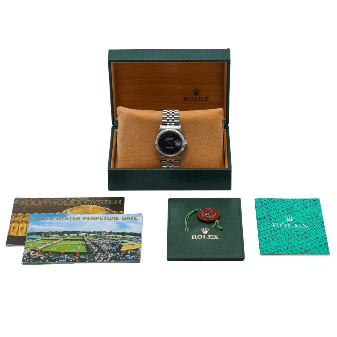 This example is powered by Rolex’s automatic Calibre 3135 movement, renowned for its robustness, accuracy, and long-term reliability. Featuring a quickset date function and chronometer certification, the movement reflects Rolex’s commitment to everyday practicality combined with exceptional engineering standards.