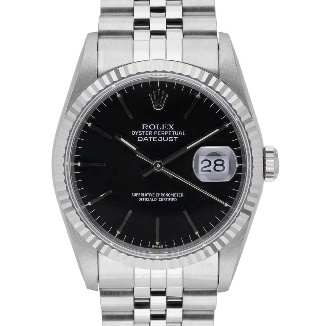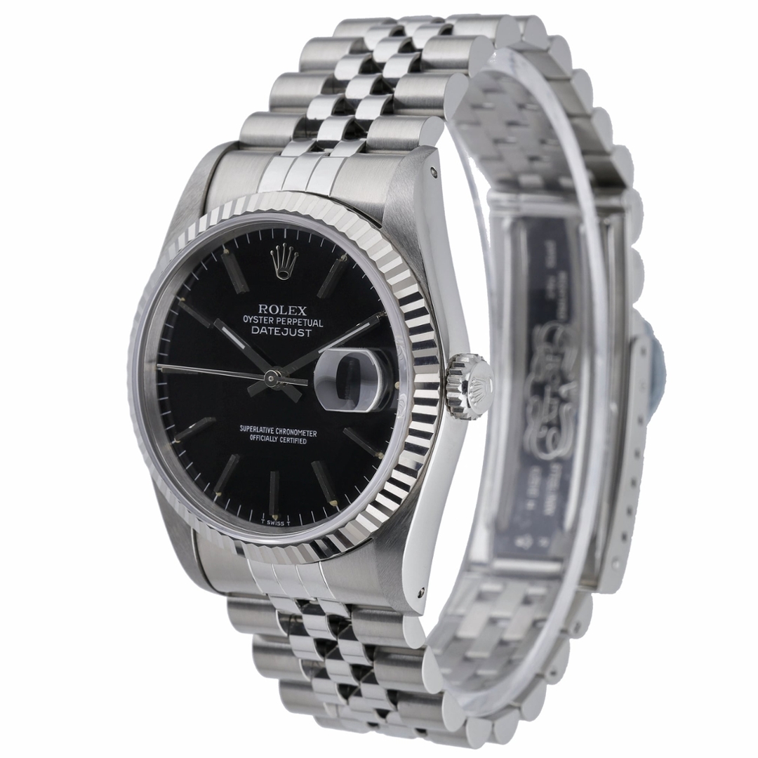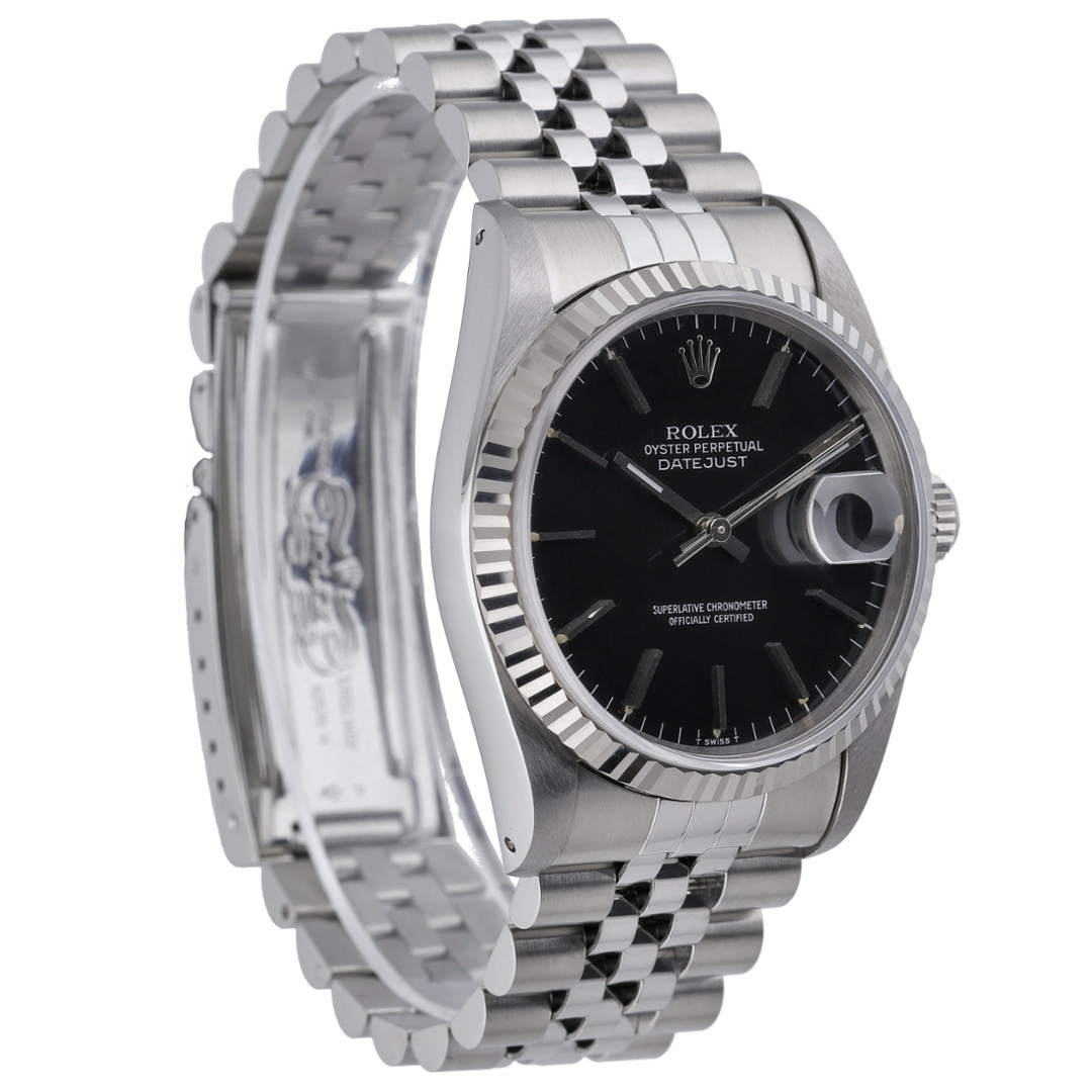 A Rolex Datejust 16234 presented in stainless steel, complemented by an 18ct white gold fluted bezel and a classic black dial. The 36mm Oyster case offers perfectly balanced proportions, with applied hour markers and the signature Cyclops date window at three o’clock, delivering immediate legibility and enduring elegance. This reference captures the pure, timeless aesthetic that has defined the Datejust line for generations.
