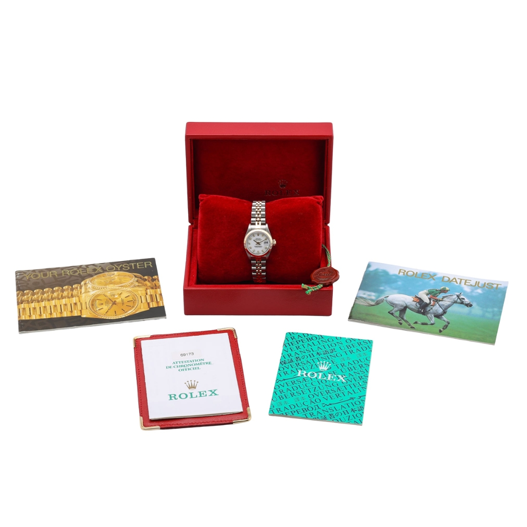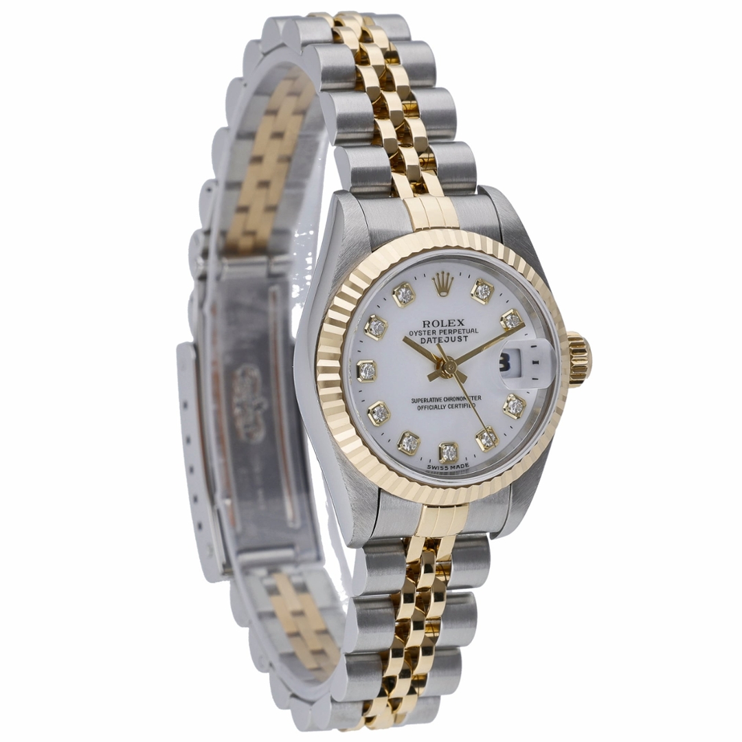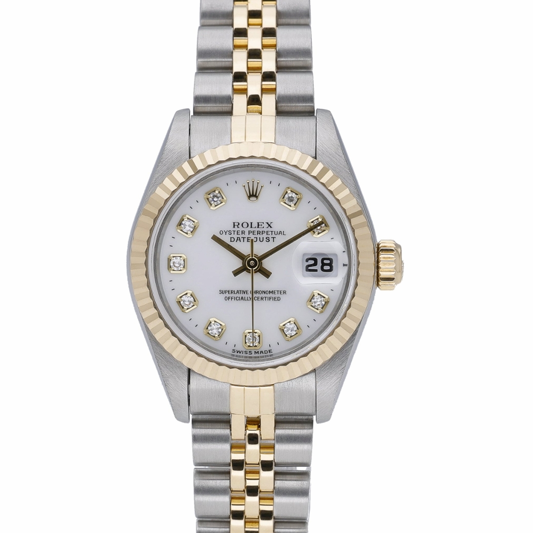 This Rolex Datejust reference 69173 is a refined bi-metal example, combining stainless steel and 18ct yellow gold with a classic fluted bezel. The white dial is fitted with original factory Rolex diamond numerals, adding depth and character while retaining a clean, elegant aesthetic. The 26mm case size gives the watch a timeless and well-balanced profile.
