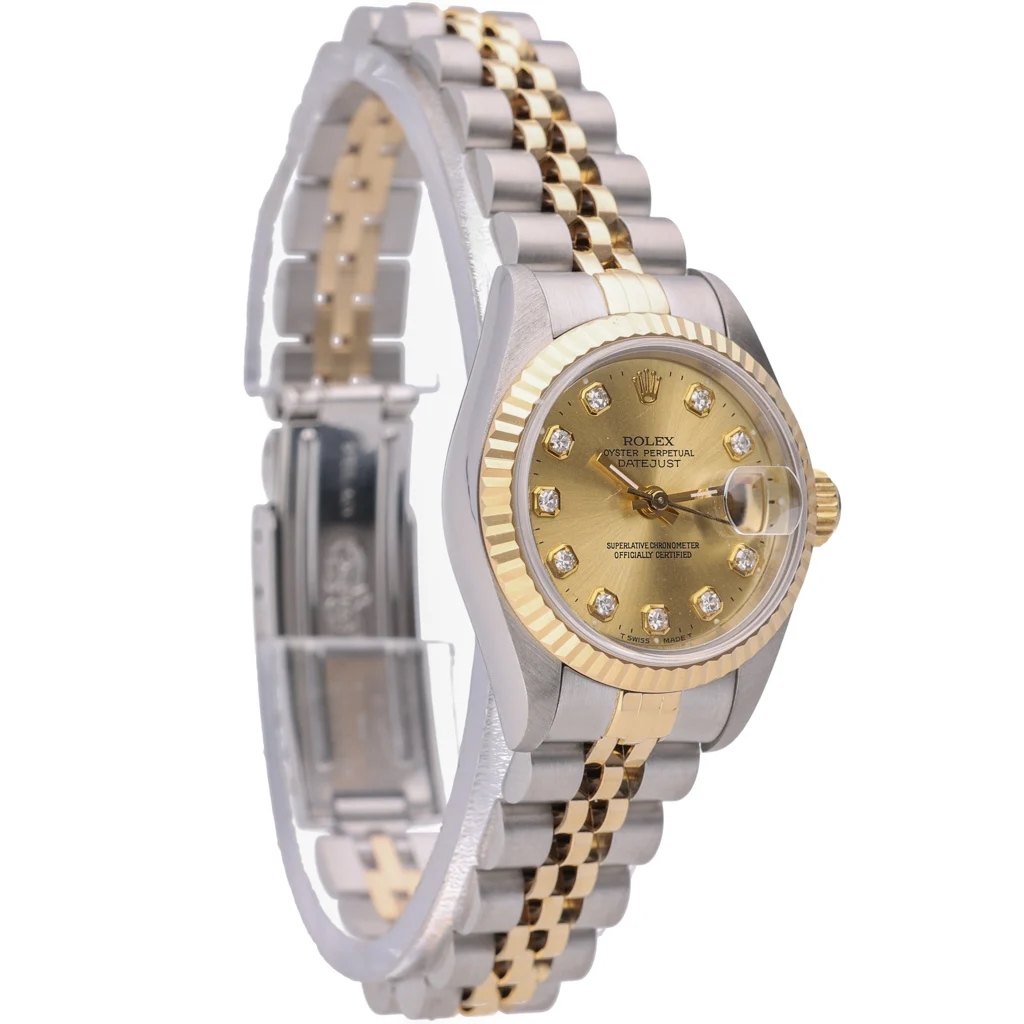 A Rolex Datejust Watch, model 69173, presented in immaculate condition. This 1997 bi-metal reference is crafted from stainless steel and 18ct yellow gold, featuring the classic fluted yellow gold bezel and a champagne dial set with original Rolex diamond hour numerals. The 26mm case is paired with the signature Jubilee bracelet and powered by the Rolex Calibre 2135 automatic movement. It is supplied boxed and certified with a 12-month WLC warranty.