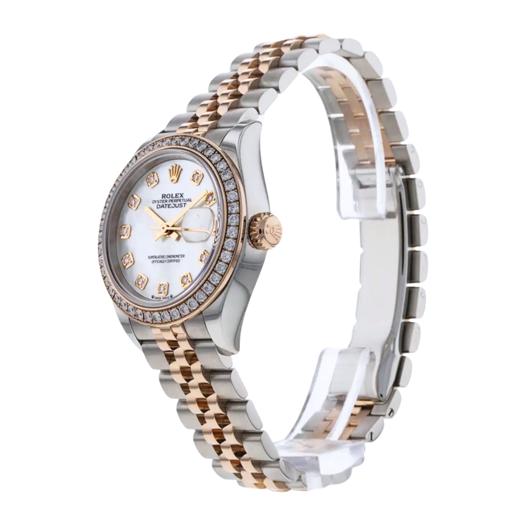 A Rolex Datejust 28, reference 279384RBR, crafted in stainless steel and 18ct Everose gold, featuring an original factory-set diamond bezel. The 28mm Oyster case offers refined proportions, enhanced by a luminous mother-of-pearl dial set with original Rolex diamond hour markers. Each dial displays its own natural iridescence, ensuring a unique finish, while the date aperture at 3 o’clock beneath the Cyclops lens maintains the Datejust’s unmistakable identity.