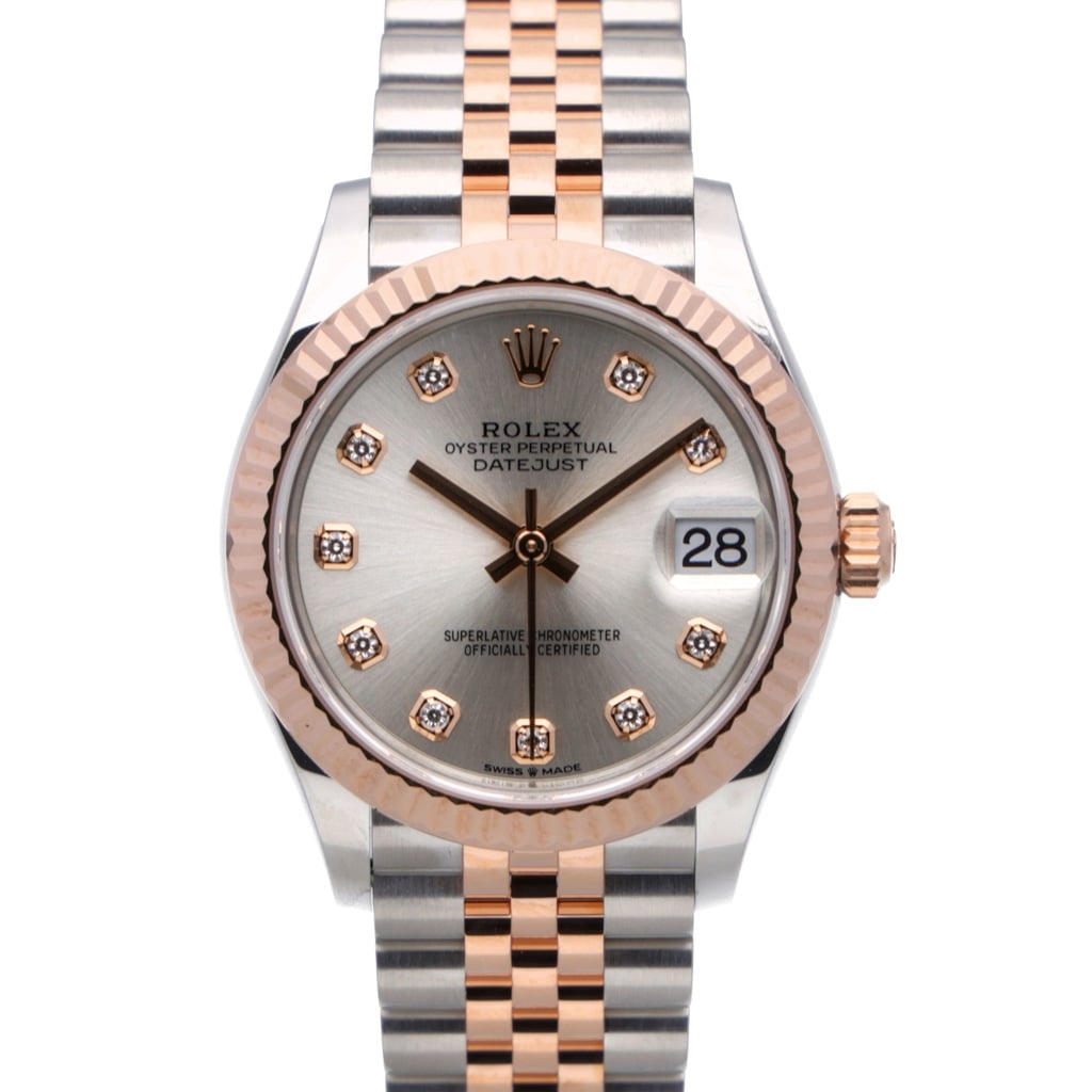 A Rolex Datejust 31 reference 278271 in Oystersteel and 18ct Everose gold, presented boxed and certified with its original full set of Rolex paperwork. The 31mm case is fitted with the signature Everose fluted bezel and mounted on the Jubilee bracelet, offering a refined balance between classic elegance and everyday versatility.