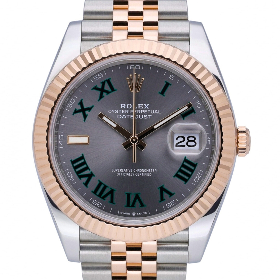 A Rolex Datejust 41, model number 126331, released in 2021, is a striking example of Rolex’s expertise in blending classic design with modern luxury. The 41mm case combines the robustness of stainless steel with the warmth and elegance of 18ct rose gold, resulting in a sophisticated yet versatile appearance. The slate dial is beautifully understated, with excellent readability and Roman hour markers. With its Cyclops lens, the iconic date window at 3 o'clock is a hallmark of the Datejust range, providing both practicality and style.
