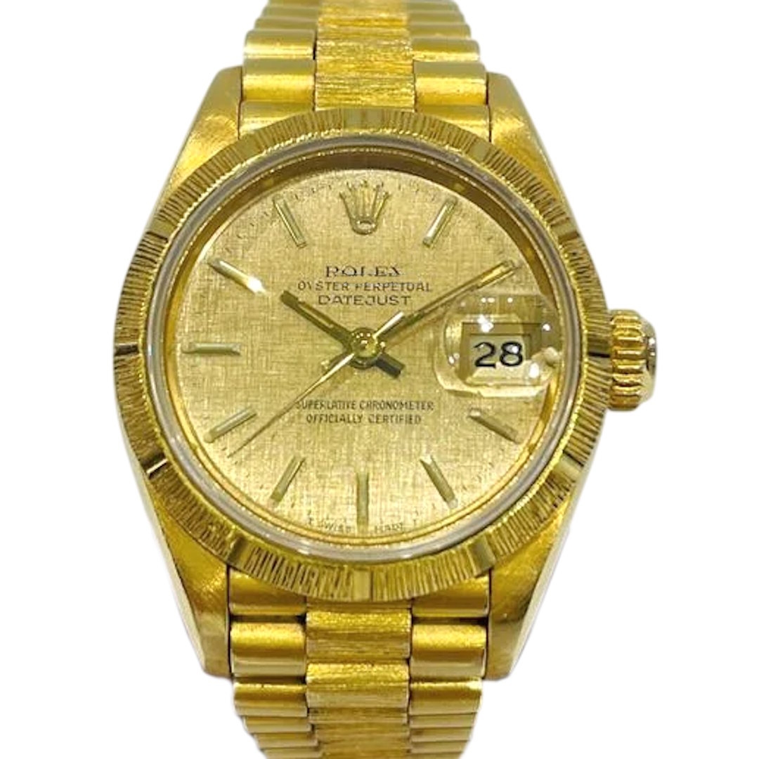 A Rolex Datejust Watch, model 69278, presented in immaculate condition. This 1987 reference is crafted entirely from solid 18ct yellow gold, featuring a 26mm Oyster case with an engine-turned 18ct yellow gold bezel and a textured champagne dial with applied baton hour markers.