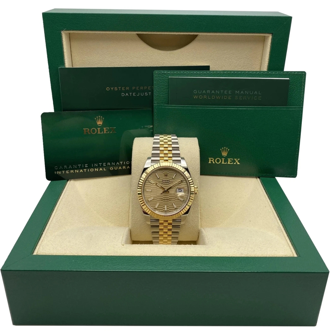 A Bi-Metal Rolex Datejust 41 Watch, Stainless Steel and 18ct Yellow Gold with a Yellow Gold Fluted Bezel on a Golden Motif Dial.