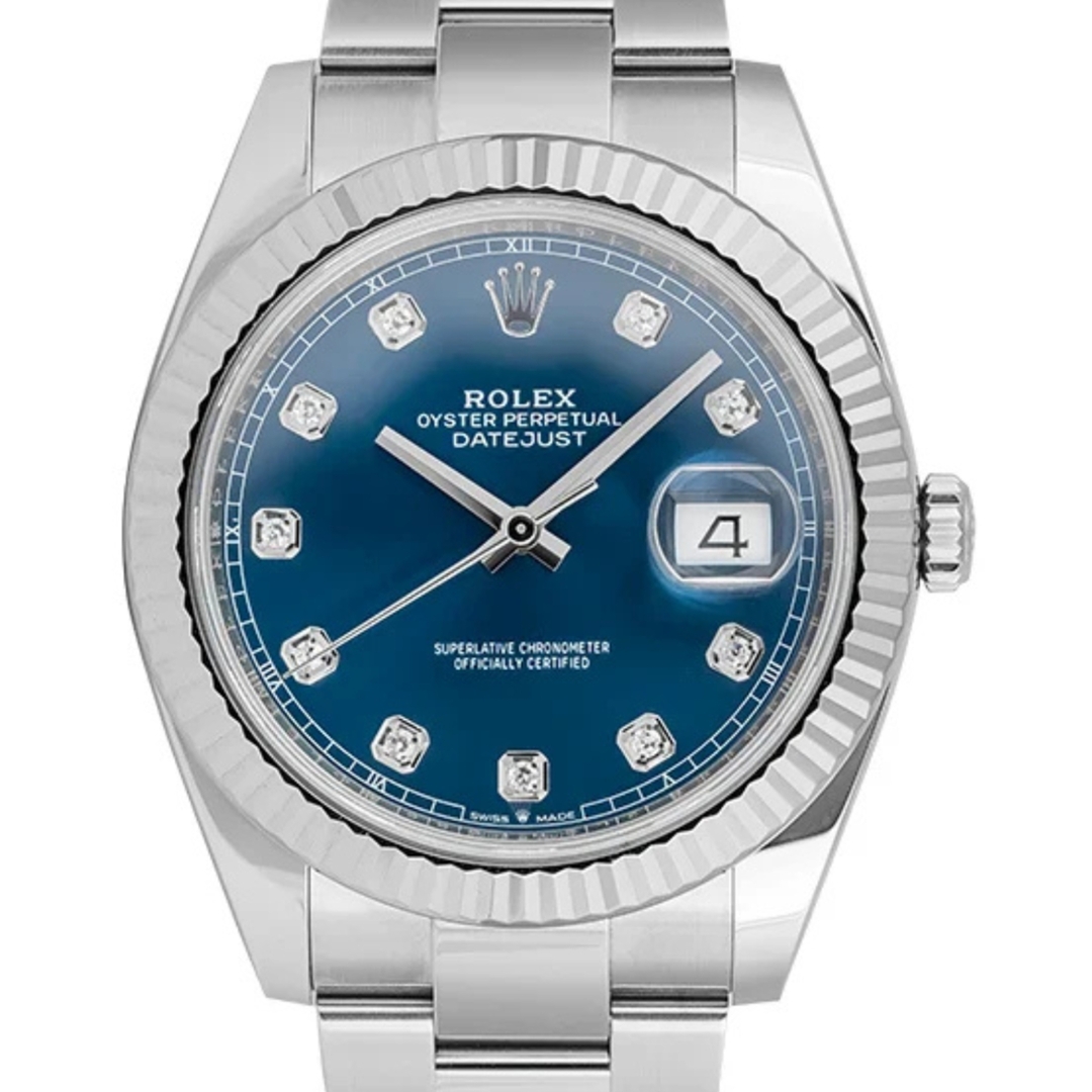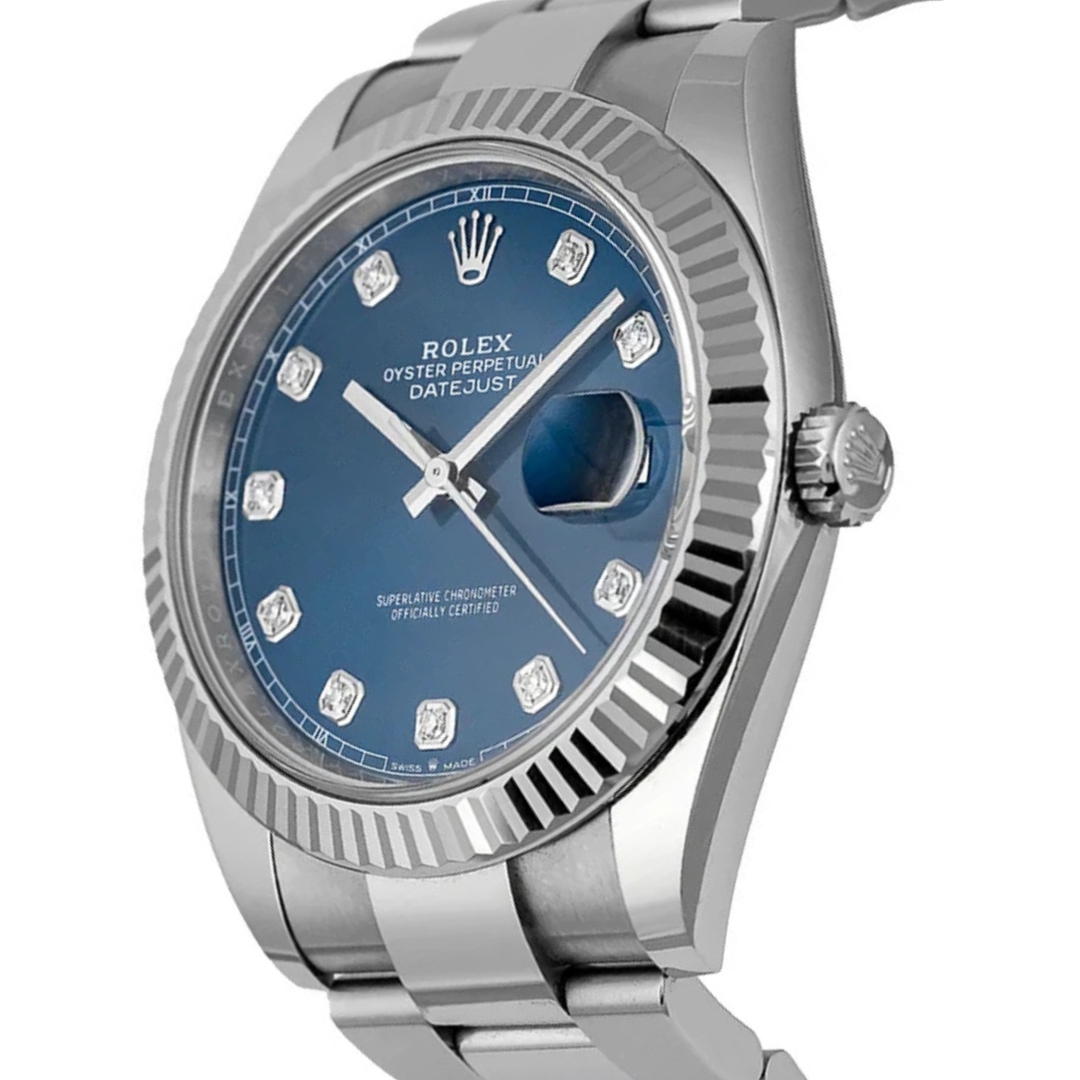 A Rolex Datejust 41 in stainless steel, fitted with an 18ct white gold fluted bezel and a rich blue sunburst dial set with original Rolex diamond hour markers. Reference 126334 represents the contemporary 41mm evolution of the Datejust, balancing strong wrist presence with refined detailing. The contrast between the crisp steel Oyster case, luminous diamonds, and the classic fluted bezel gives this configuration a distinctly elevated yet versatile character.