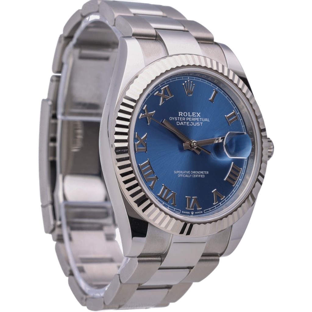 A Rolex Datejust 41 Watch, Stainless Steel with an 18ct White Gold Fluted Bezel on an Azzuro Blue Roman Dial.