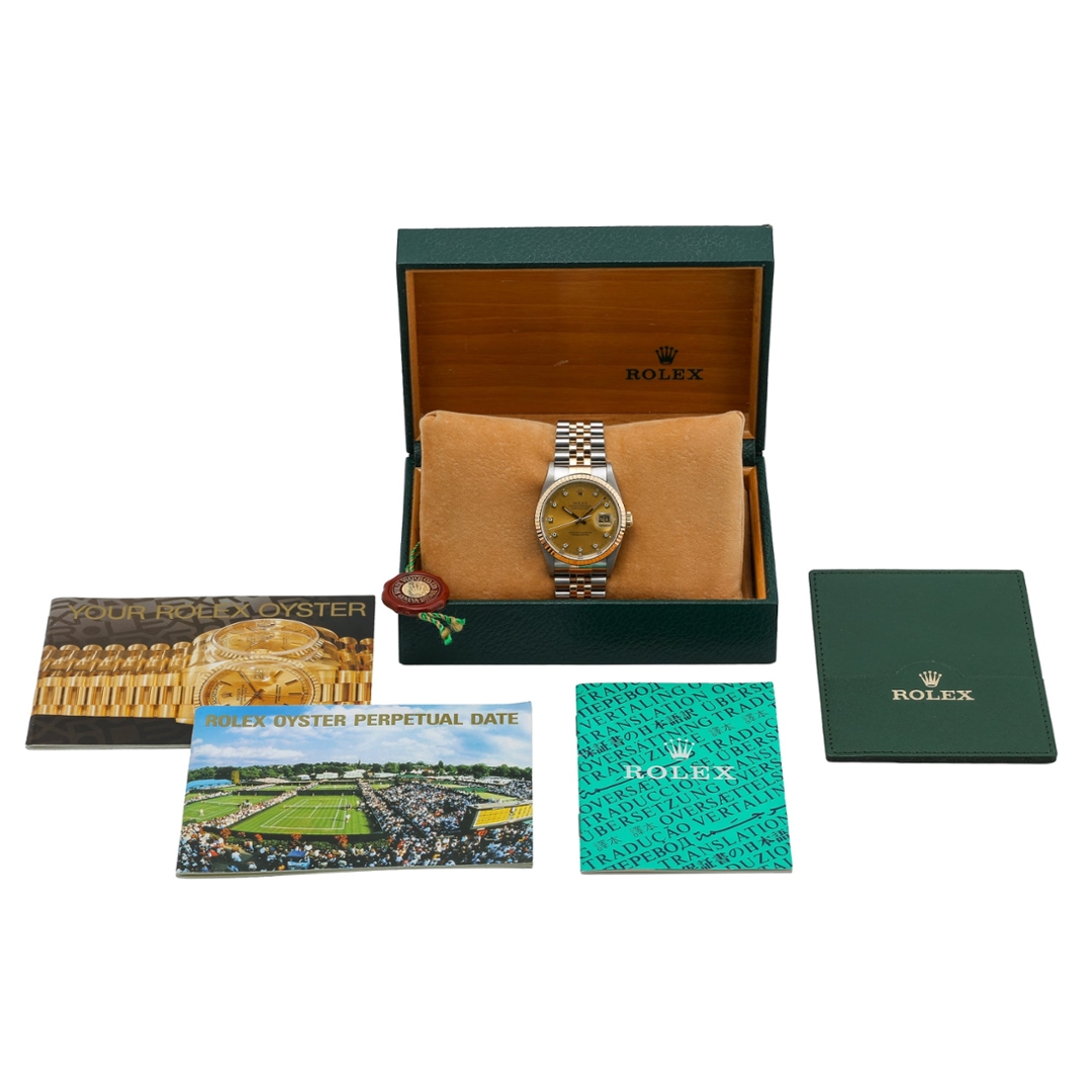 The champagne sunburst dial is fitted with original Rolex diamond-set hour markers in yellow gold settings, offering subtle brilliance against the warm dial tone. The applied coronet at 12 o’clock and the date aperture at 3 o’clock, complete with Cyclops lens, maintain the classic Datejust layout. The dial, handset, and detailing are all consistent with factory specifications.