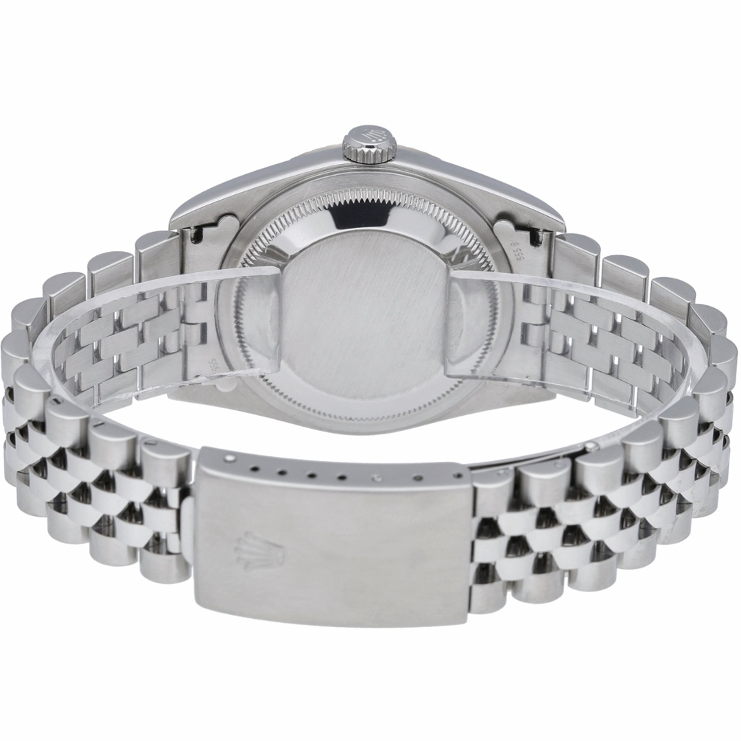 The dial is not a plain white Jubilee dial as stated. Instead, it features a white-embossed “Jubilee” motif dial with applied Arabic numerals, giving it a far more distinctive, textured appearance. The black Arabic numerals contrast sharply against the patterned background, while the date aperture at 3 o’clock, complete with Cyclops lens, preserves the classic Datejust layout.