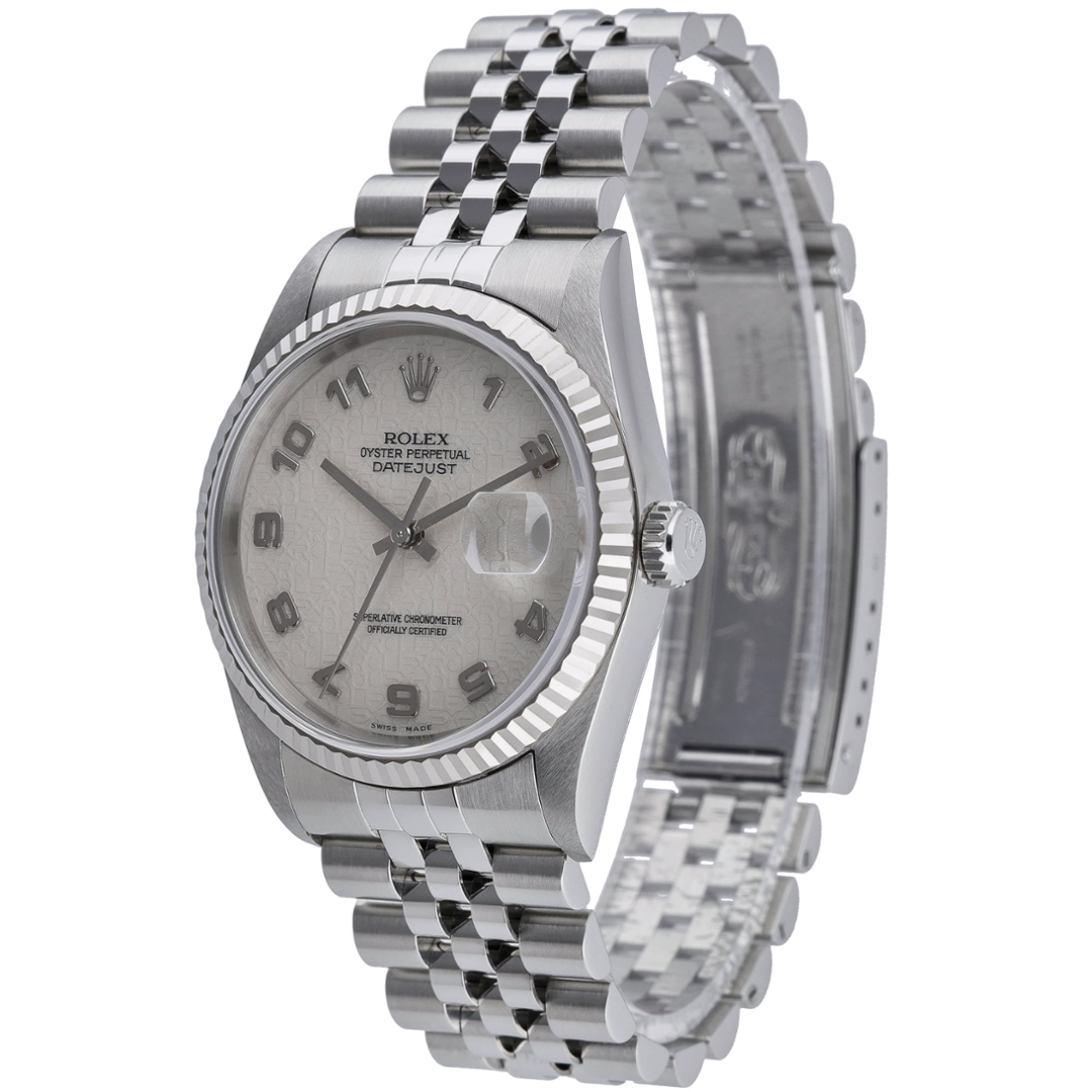A Rolex Datejust 36, reference 16234, presented in stainless steel with an 18ct white gold fluted bezel, offering a refined and timeless configuration within the classic Datejust range. The 36mm Oyster case is paired with the Jubilee bracelet, delivering both comfort and traditional appeal, while maintaining the recognisable profile that has defined the model for decades.